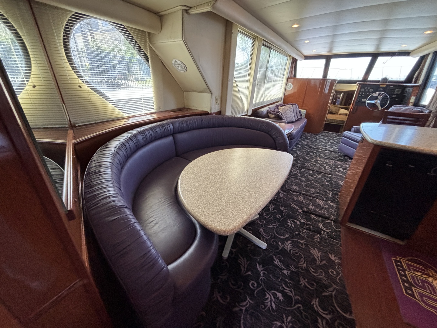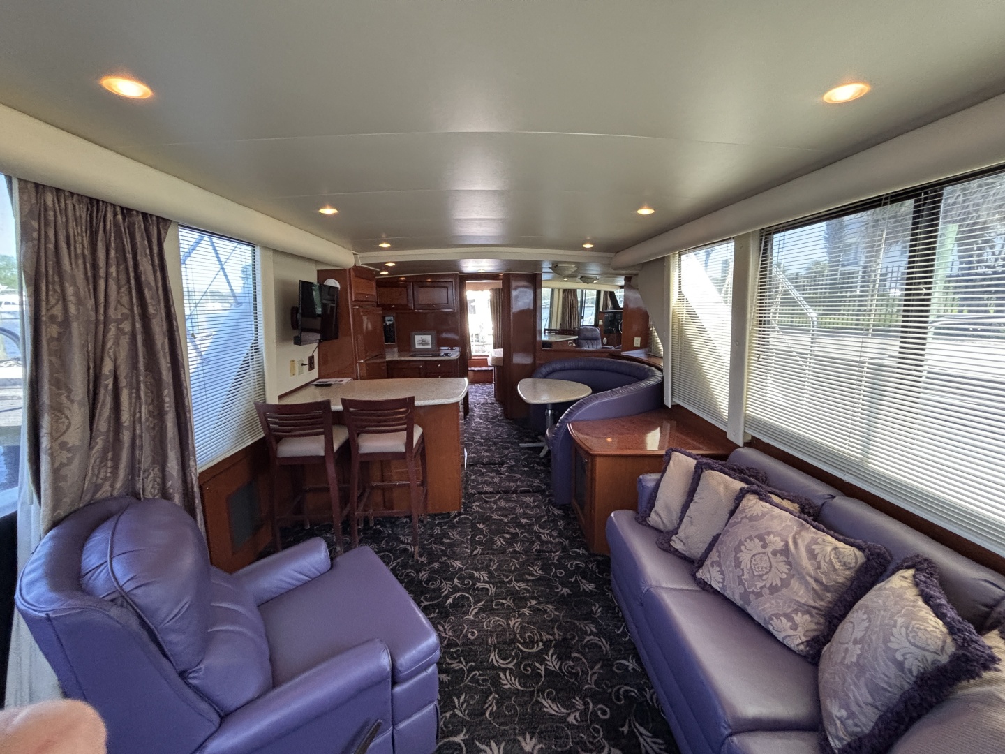 - The spacious salon has panoramic windows both port and starboard midship with a full size couch, comfortable recliner, u-shape dinette for 6, functional galley and a cozy breakfast/coffee bar.