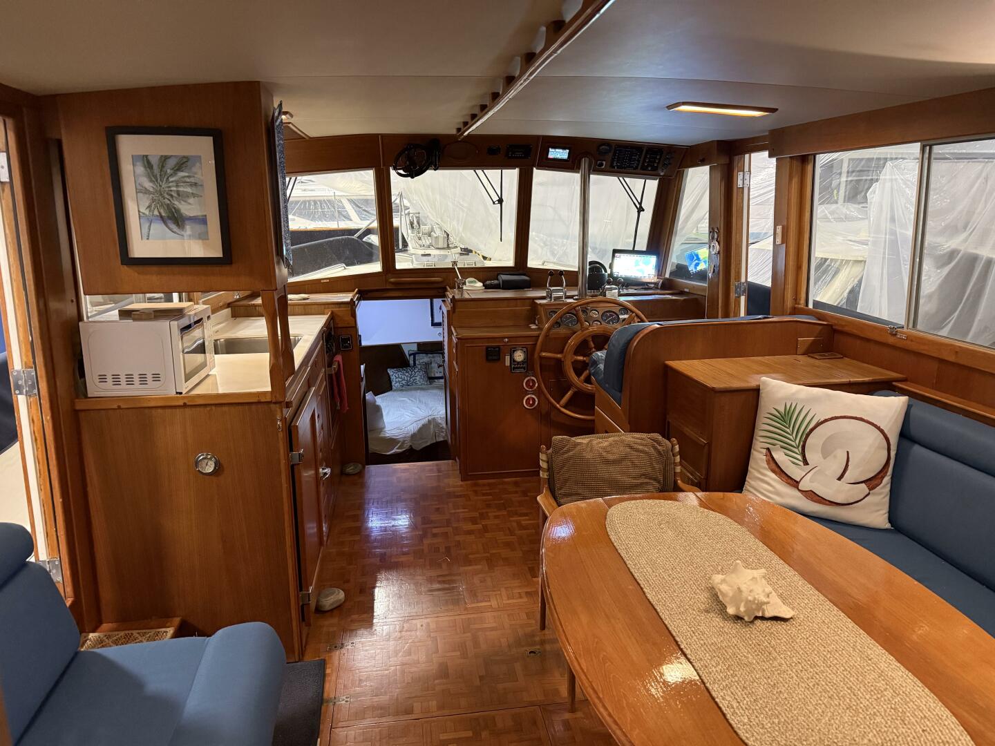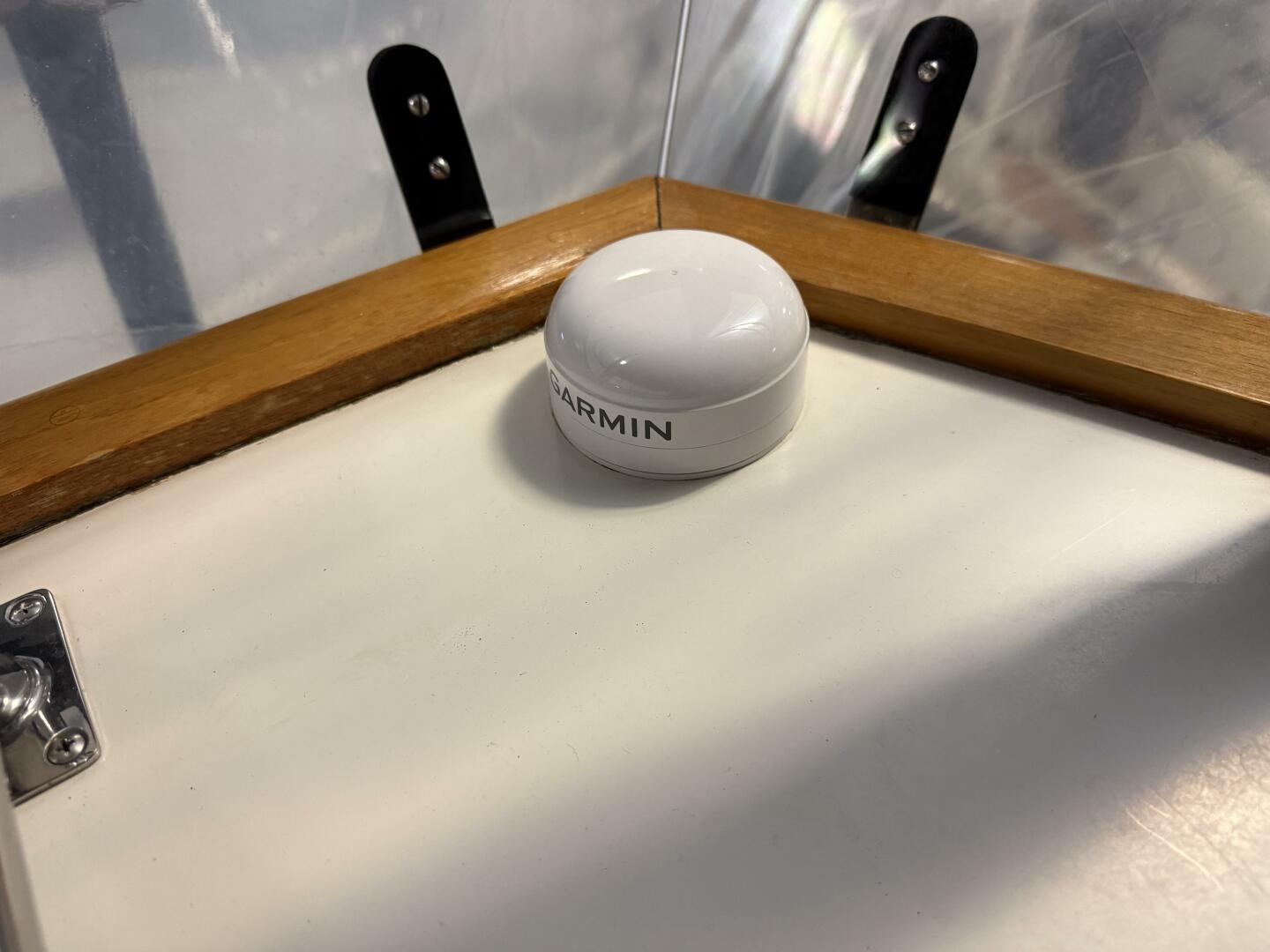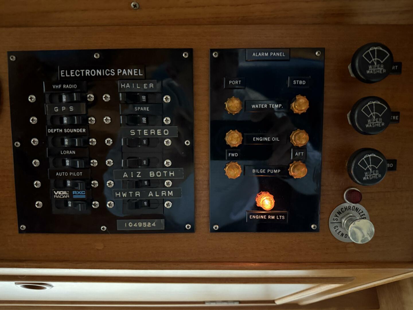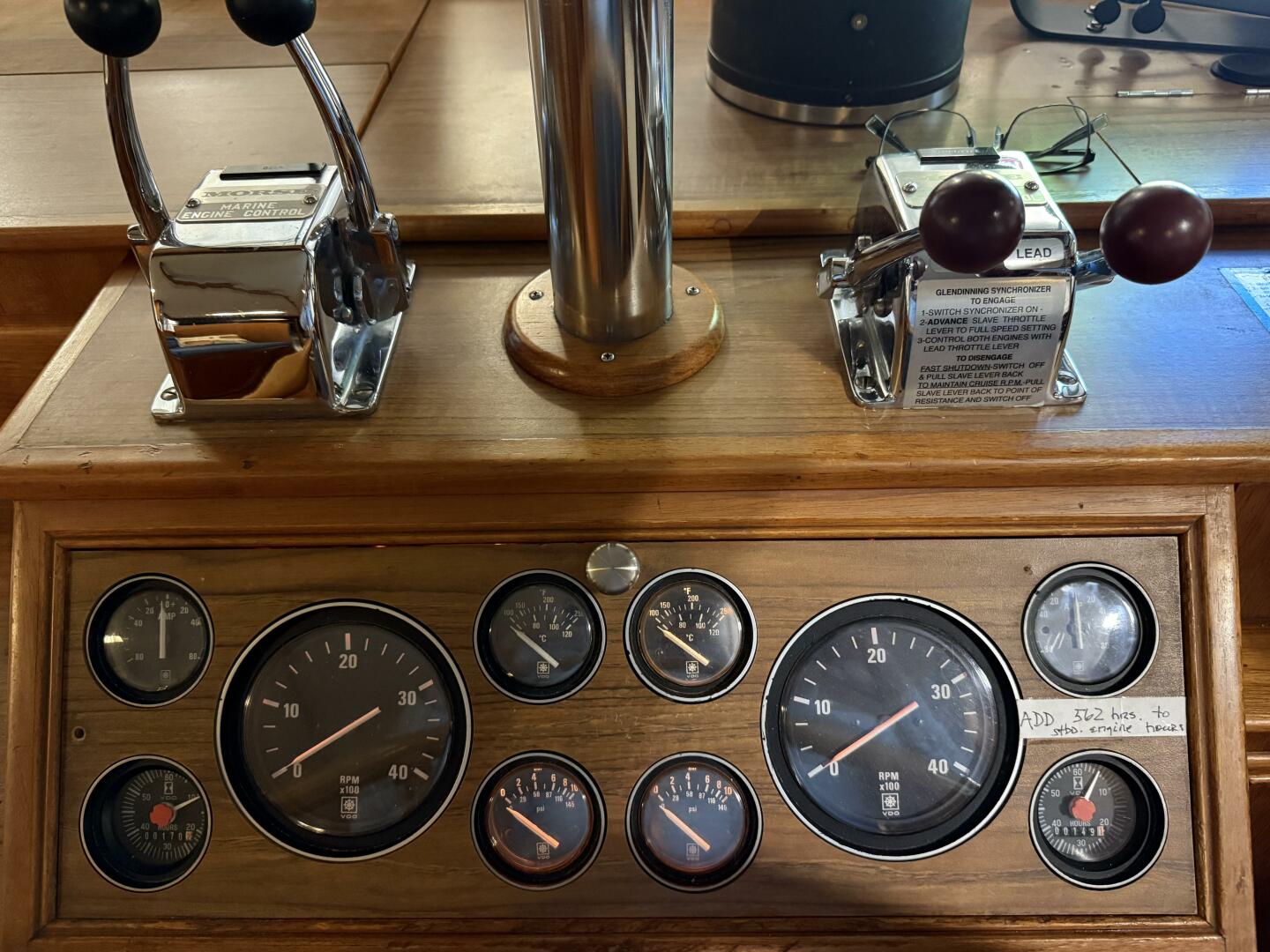 Forward of the main salon on the starboard side is the helm with all brand new navigation electronics, a beautiful teak wheel and immediate door access to the side-deck.