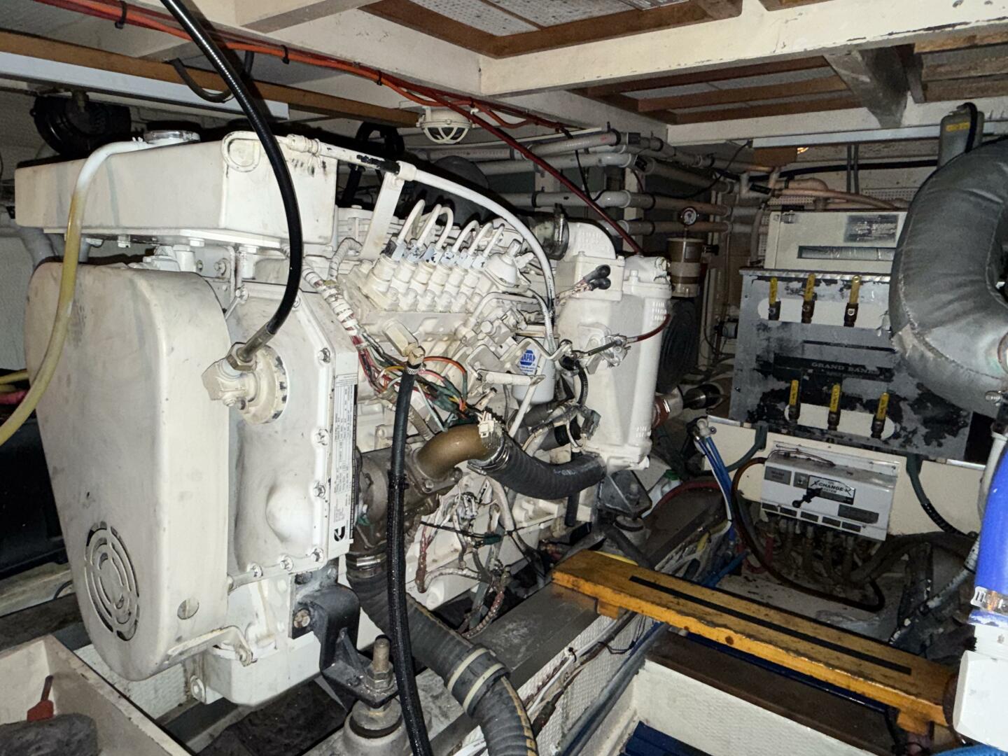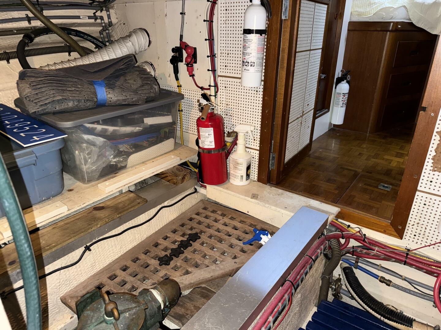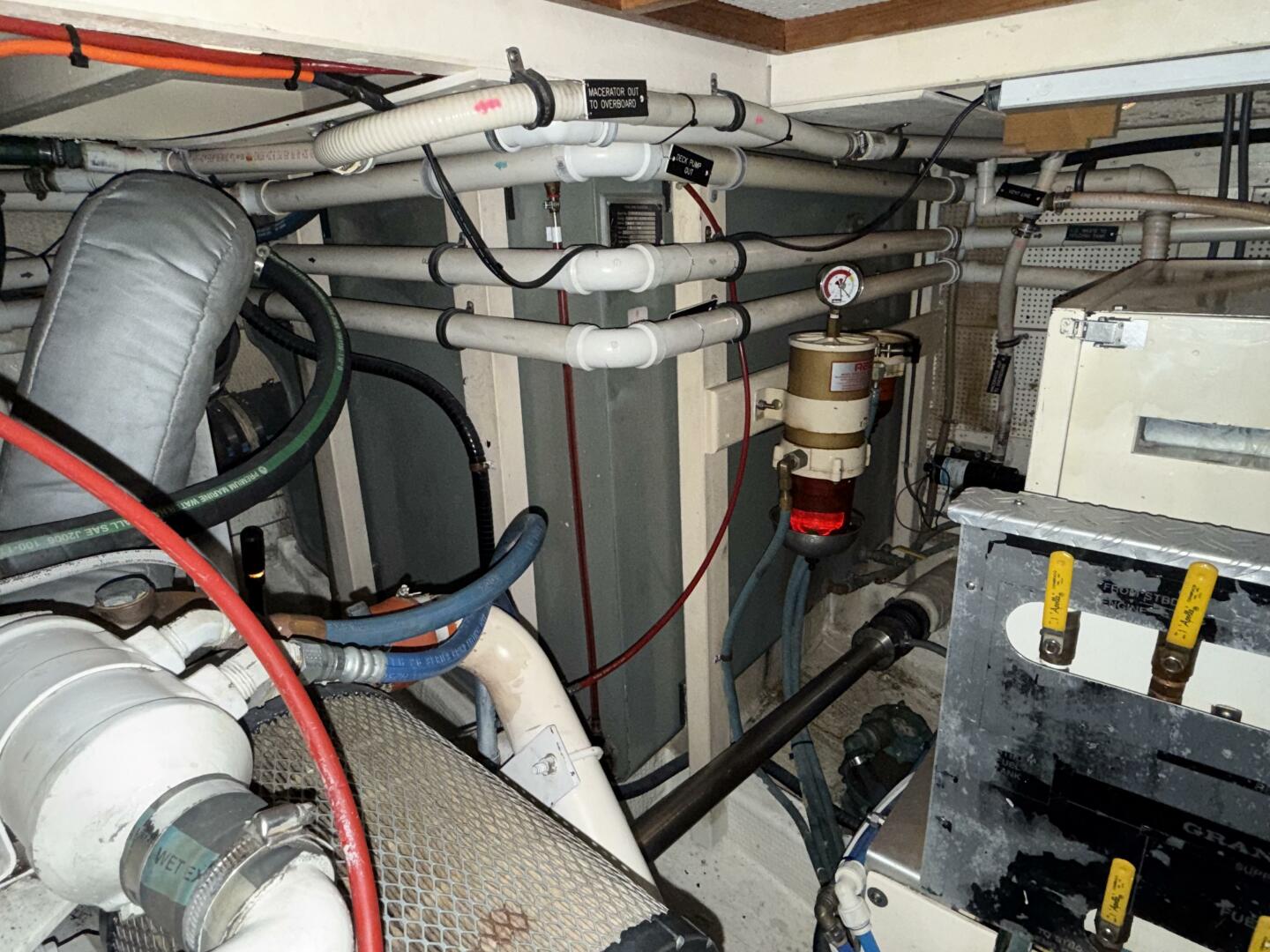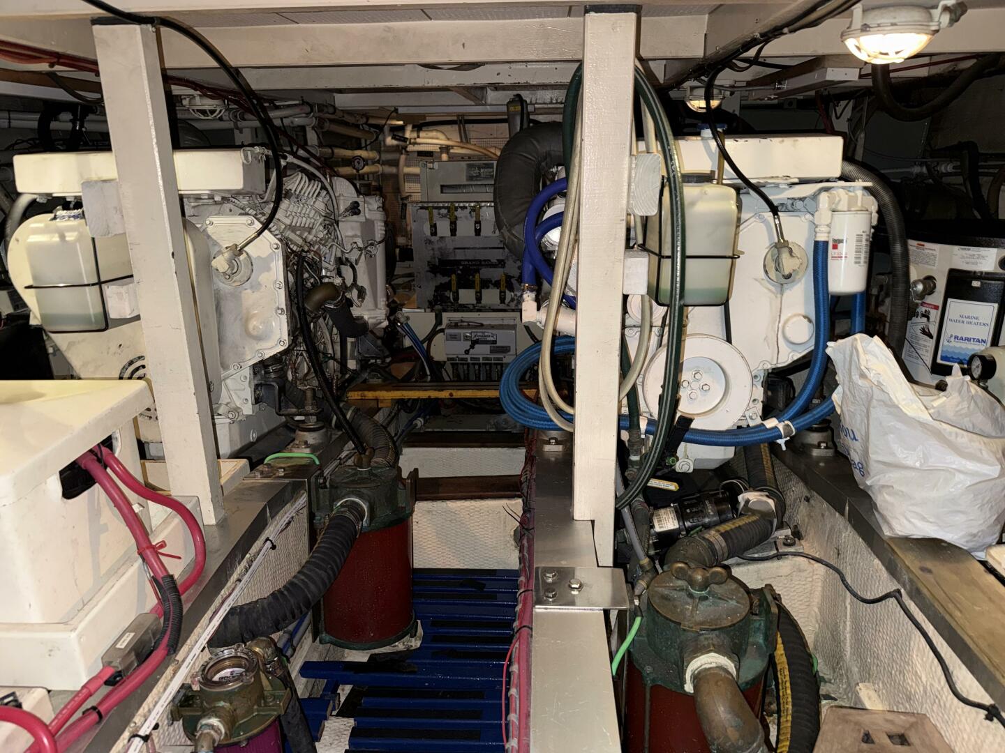 The engine room can be accessed either through a doorway behind the stairs in the aft end of the forward cabin or through lifting panels in the main salon floor. The engine room is nicely laid out with clear access to the main engine, generator, batteries, all through-hulls, and electrical wiring.