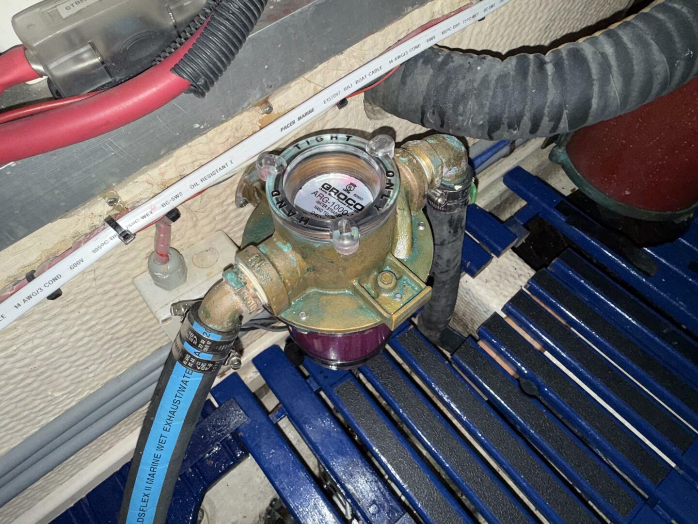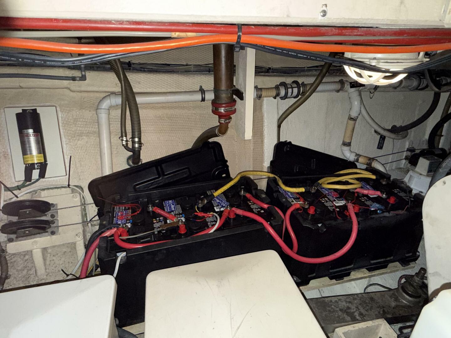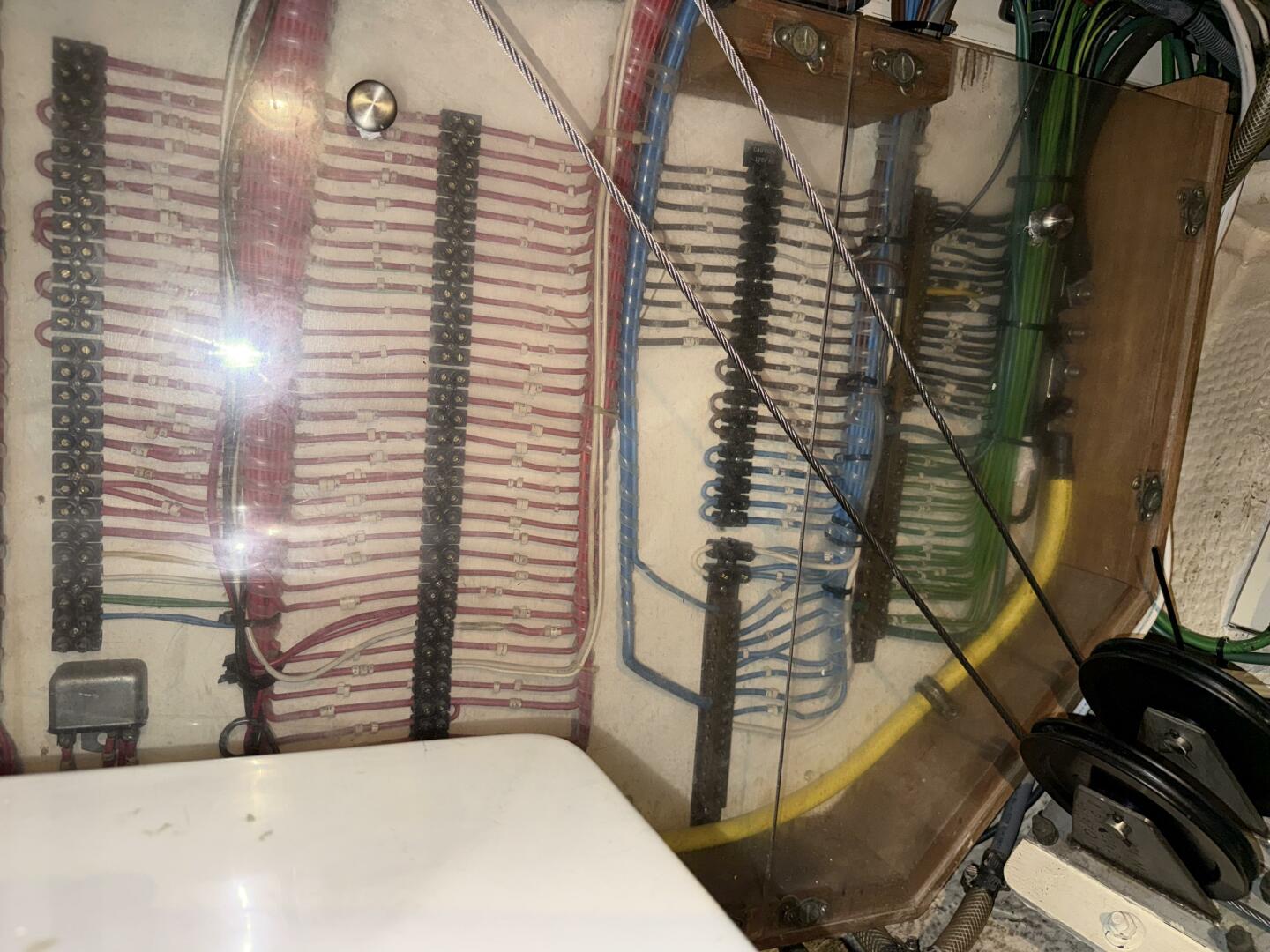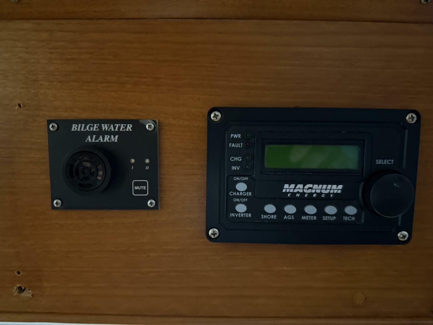 The engine room can be accessed either through a doorway behind the stairs in the aft end of the forward cabin or through lifting panels in the main salon floor. The engine room is nicely laid out with clear access to the main engine, generator, batteries, all through-hulls, and electrical wiring.