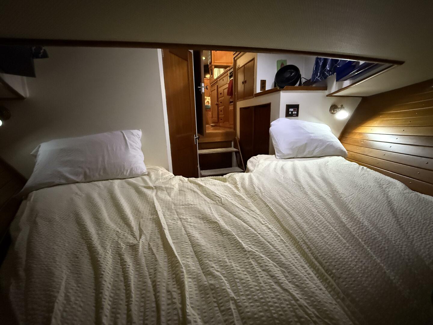 Forward of the helm and galley and down three steps is the forward cabin featuring a comfortable Vee-berth which makes a generously sized double berth and an en-suite "wet" head with shower. There is a hanging locker and plenty of drawer storage and there is door-access to the engine room behind the steps.