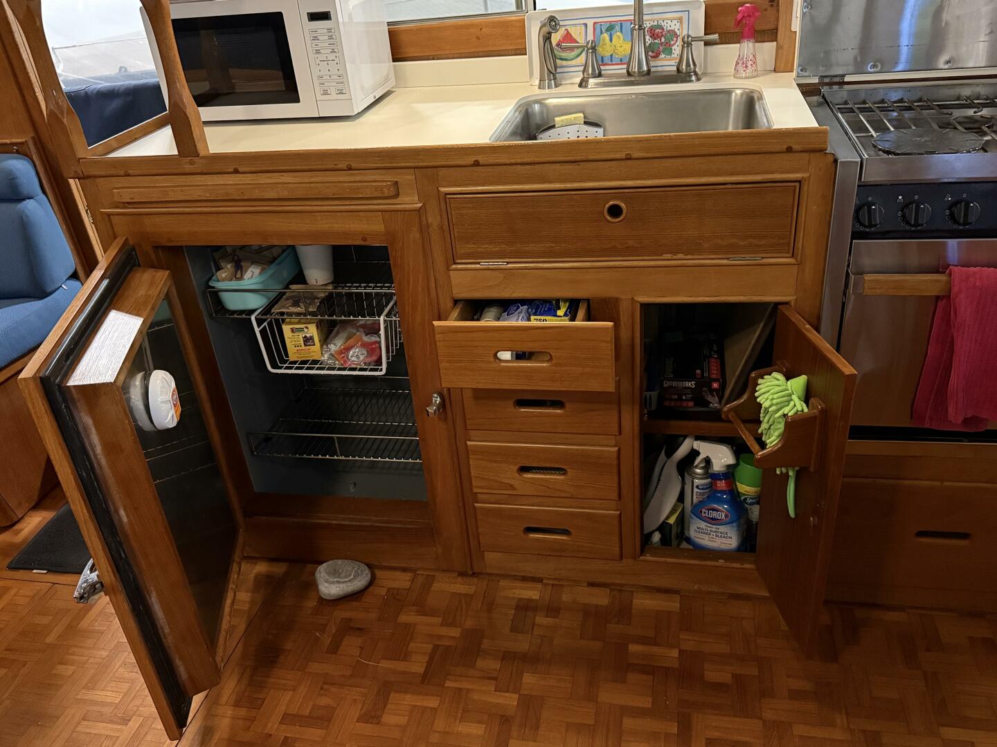 To Port, opposite the helm is the well organized and nicely laid-out galley with stainless sink, microwave oven, three burner Force 10 propane stove (2021), plenty of storage below the counter and an overhead cabinet and even a pull-out counter section to maximize working space.