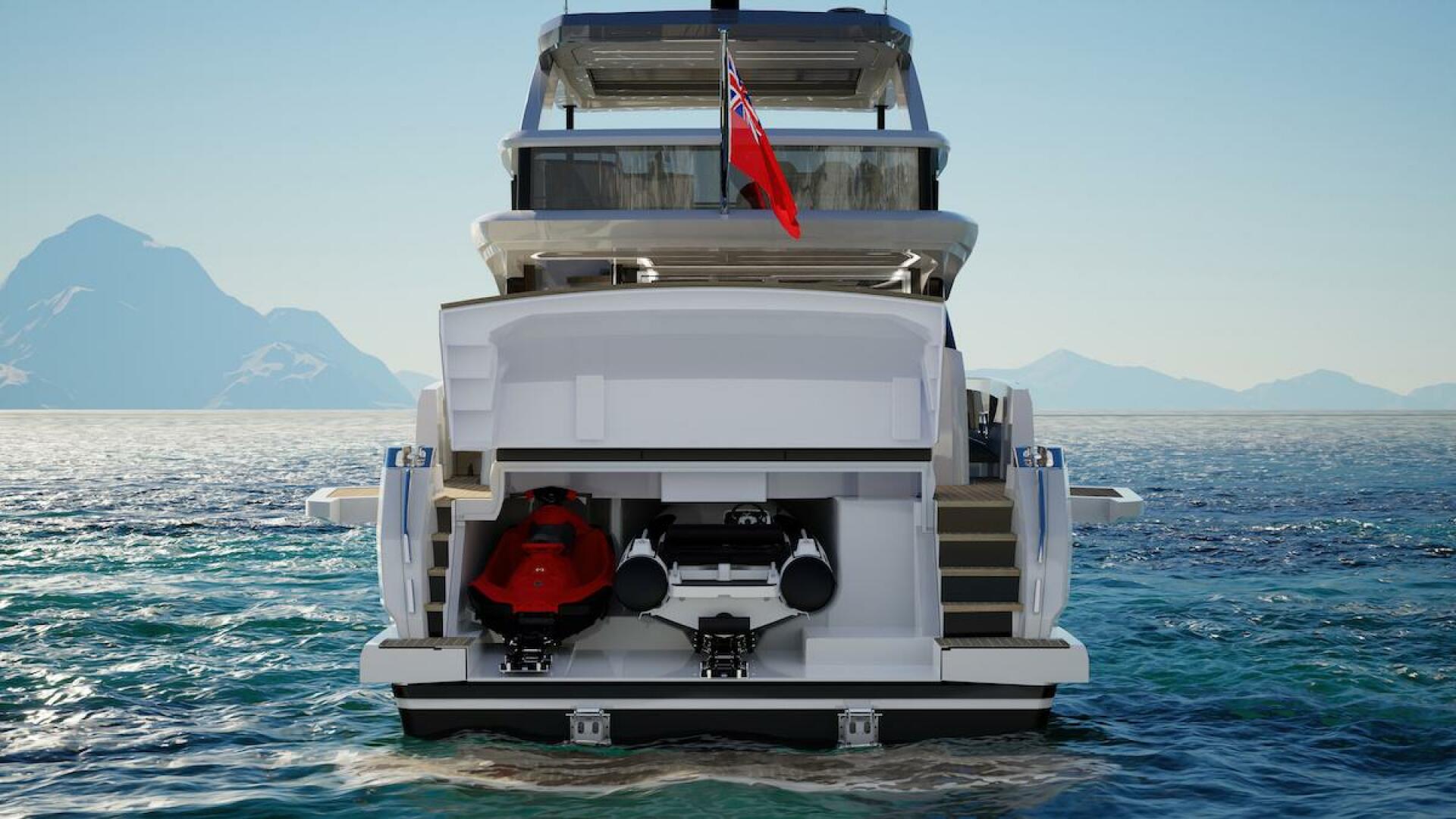 The Pearl 73 includes a spacious garage designed for water toys and tenders.