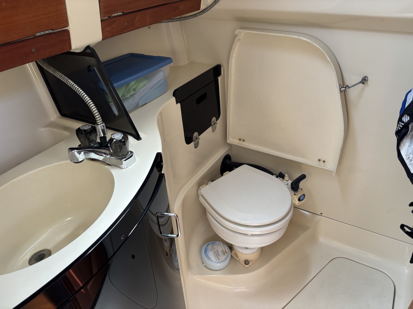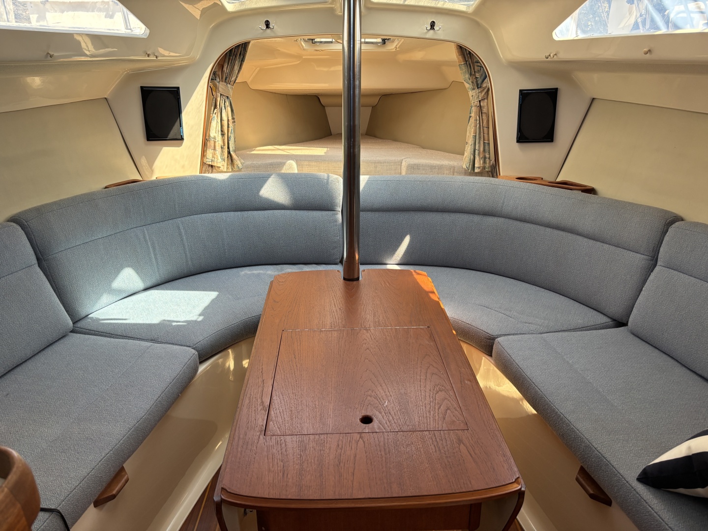 Construction is conventional fiberglass with a moderately displaced hull, wing keel and spade rudder. The B&R rig eliminates the back stay allow for a large mainsail and fractional jib making for easy tacking and sail handling. The 29.5 has a large cockpit with walk through molded swim platform with boarding ladder making getting in and out of the water a breeze. The side deck are broad and secure with plenty hand holds making going forward easer than many larger boats. The interior 6"2" is an open concepts creating a large, bright and airy environment. The main salon features a u-shaped dinette (seating for 6) and converts to a large double berth. Sleeping arrangements include a V-berth forward and a massive athwartship double beneath the cockpit. There is a fully enclosed head to starboard with a toilet, vanity and shower. The galley is to port with a microwave, gas stove, storage and an ice box. There was a prior owner fresh water leak at the hot water tank (removed) with non visible wood shelving damage under the v-berth. Price reflects this defect.