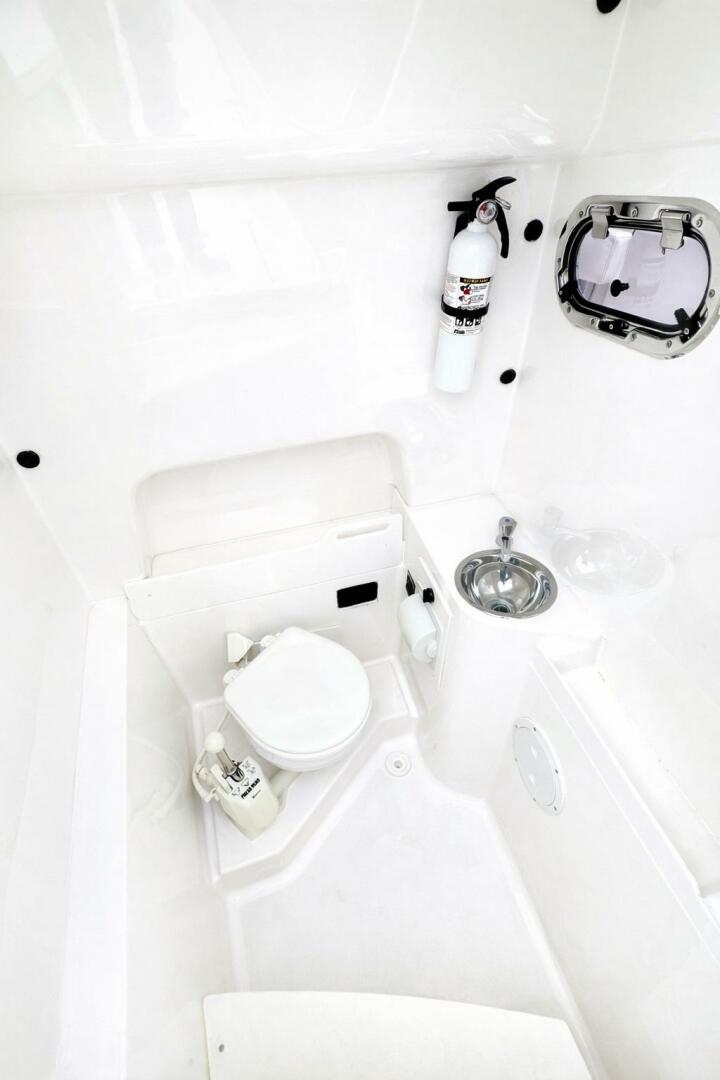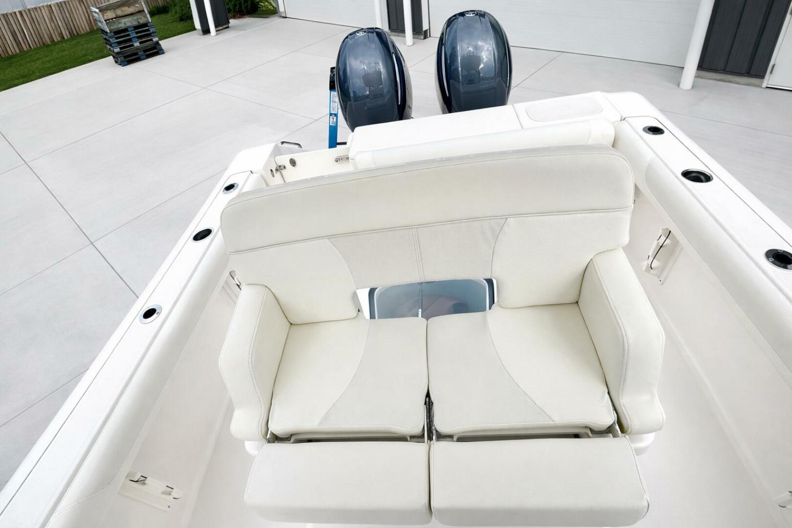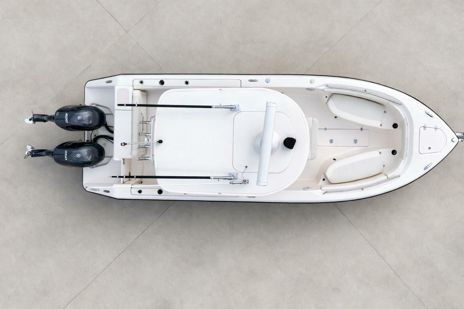 All molded hatches throughout the boat are finished inside and out. Interior highlights include bow storage port and starboard, a thru-hull optional windlass system in the bow, forward opening head access and a custom surfboard styled, vacuum-infused hardtop. The helm is protected by a curved, recessed acrylic windshield built to accent the stylish lines throughout the interior and exterior appointments.