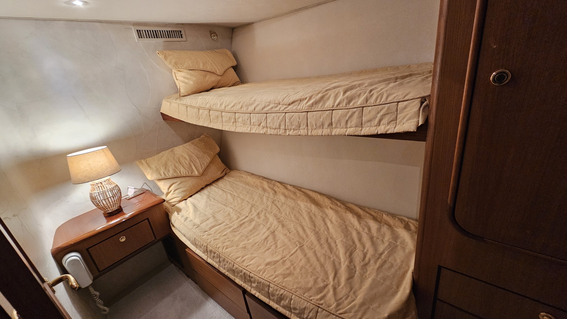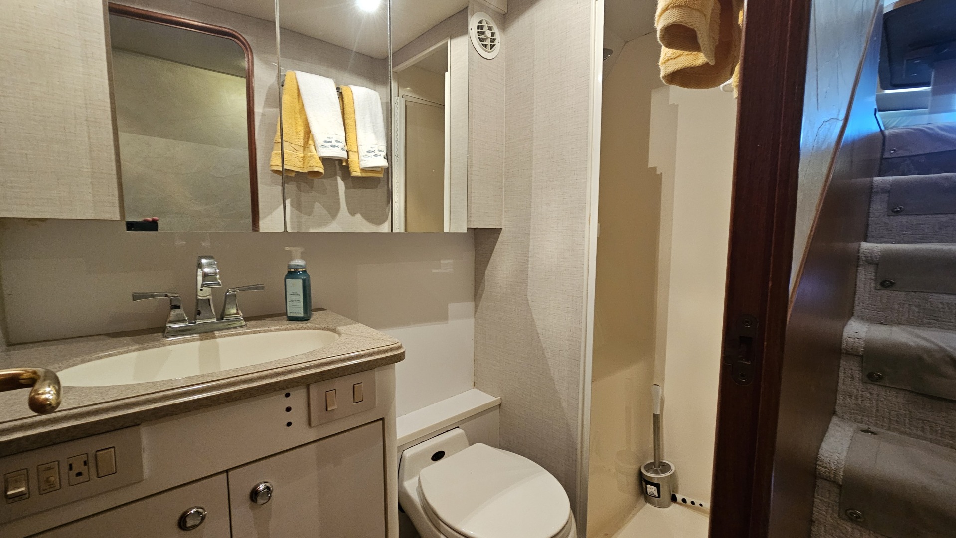 bathtub in the master stateroom head, and three guest heads, each with a separate stall shower. An excellent performer,