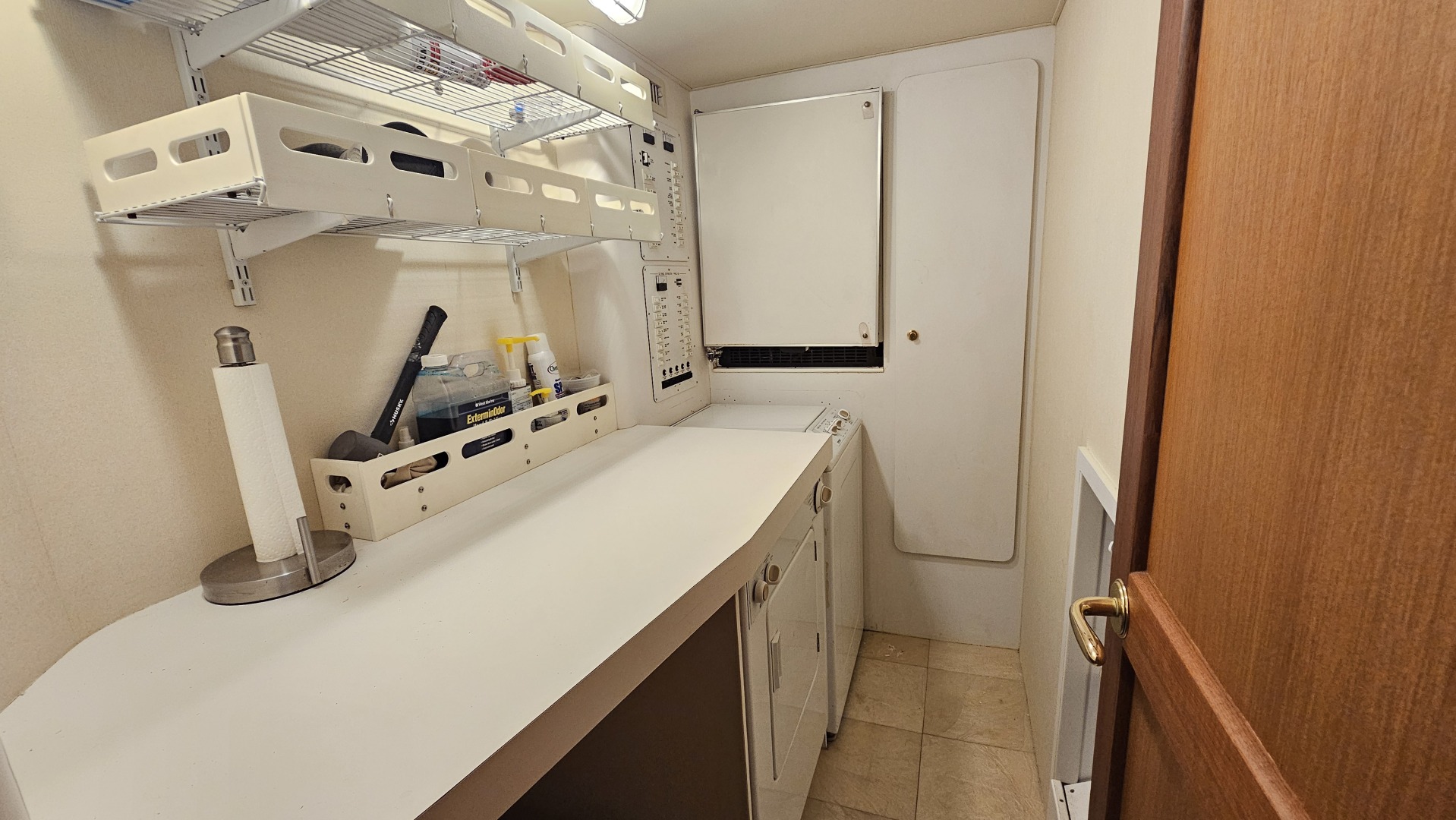 models. A VIP stateroom is in the forepeak, and a utility room with a washer/dryer and freezer is located between the