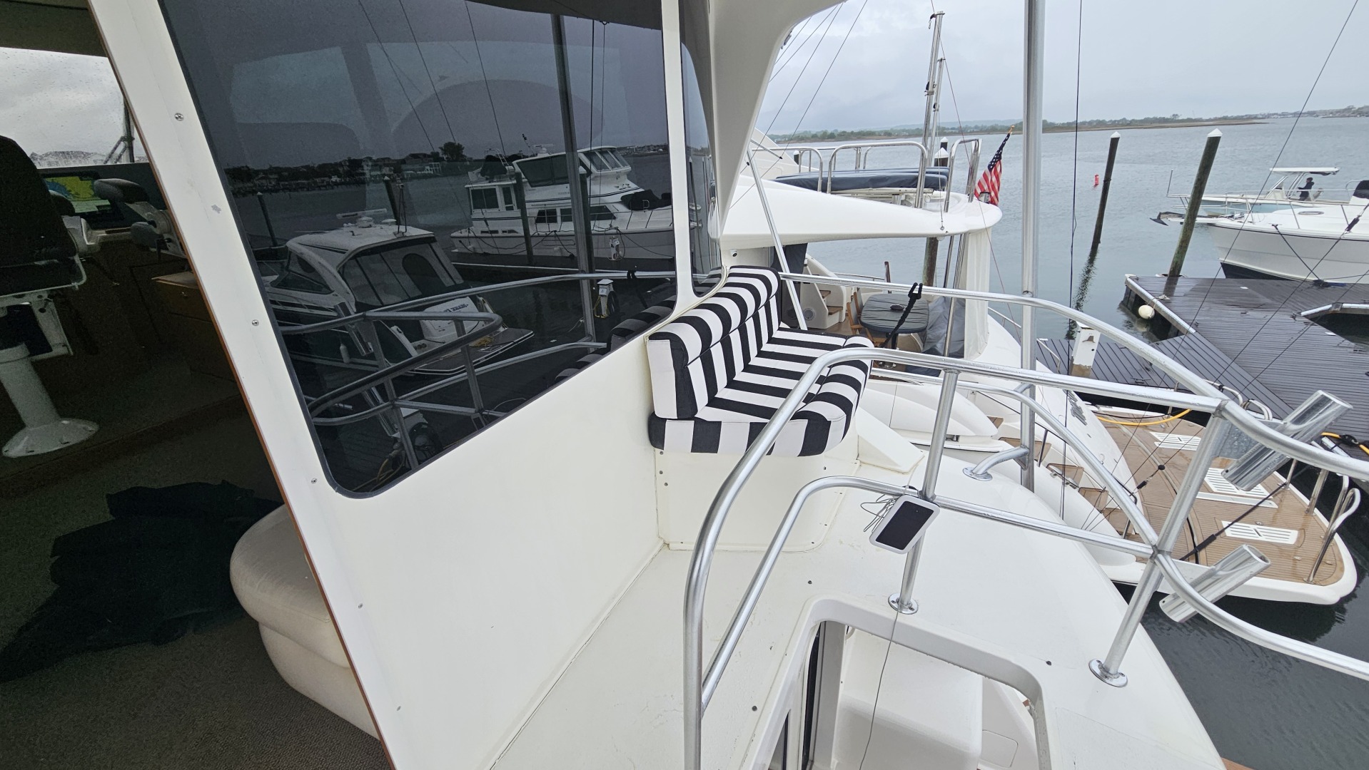 custom mezzanine seating area with refrigerated compartments. Additional features include an enclosed flybridge, a