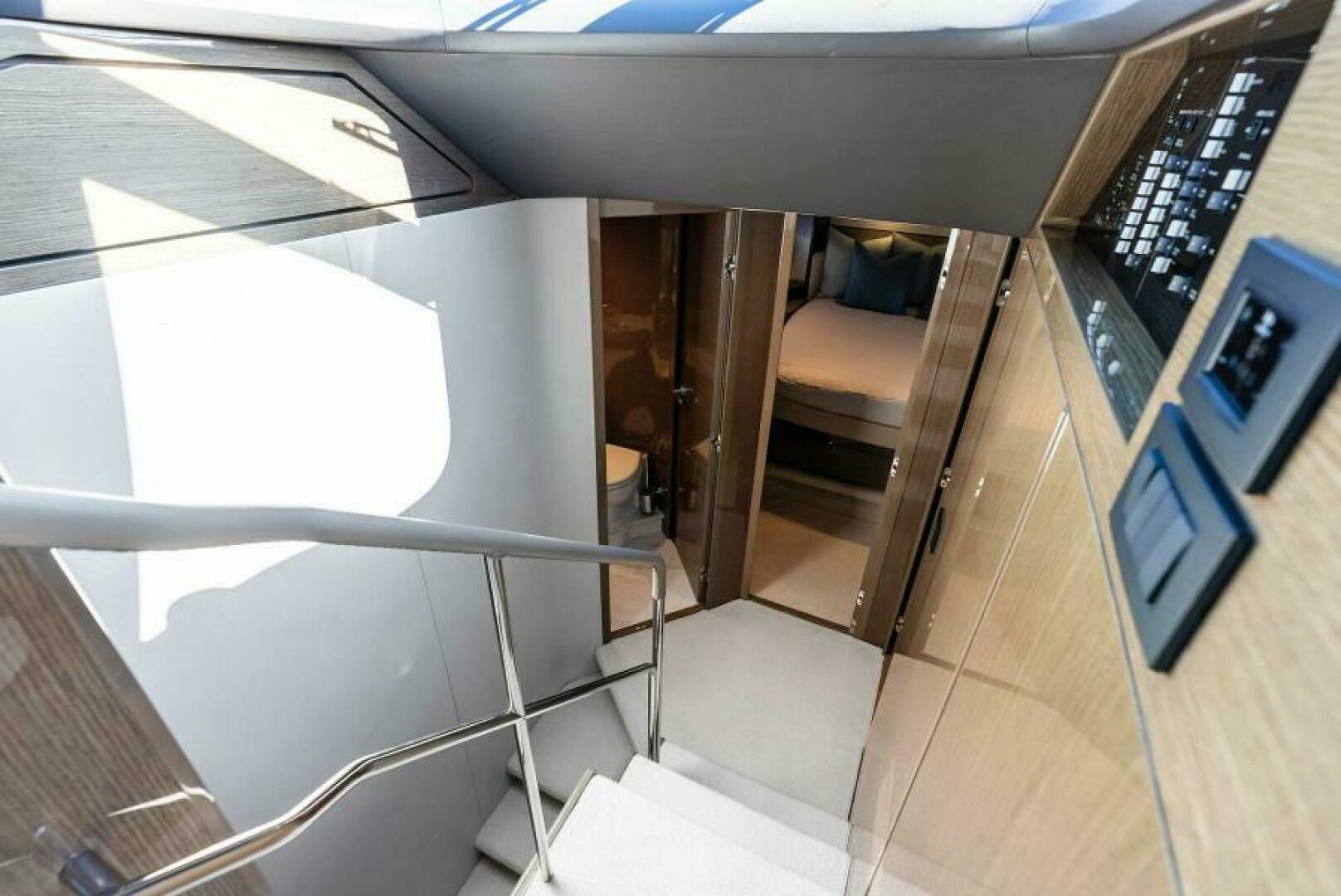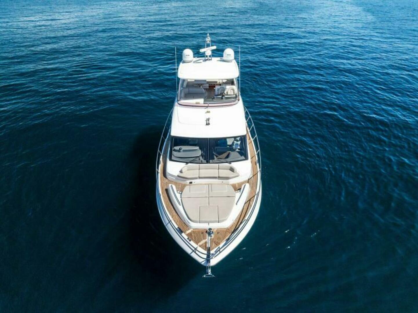 Step aboard and experience luxury at sea like never before. From her elegant teak decking to her expansive flybridge, this yacht is designed with space, style, and performance in perfect harmony. The 58.4 sq. ft. flybridge is a haven for relaxation and entertainment, featuring a convertible sunbed, twin helm seats, a wet bar, and thoughtfully designed dining spaces. Her signature wraparound windscreen and vast panoramic saloon windows flood the interior with natural light while providing uninterrupted ocean vistas. Below deck, expansive hull windows continue the bright and airy ambiance, enhancing every stateroom with a sense of open luxury. Powered to reach exhilarating speeds, the F55 offers not only remarkable performance but exceptional handling and stability, thanks in part to the SeaKeeper 9 Gyro Stabilizer. Inside, the Princess F55, showcases a refined Silver Oak Gloss interior, offering a sophisticated contrast of textures and finishes. The spacious salon is appointed with a U-shaped sofa, with the versatility of a folding-leaf dining or coffee table facing a loveseat. Accommodations include a full-beam master stateroom, a luxurious forward cabin, and a flexible starboard guest cabin that converts from twin beds to a double, all with ensuite bathrooms.