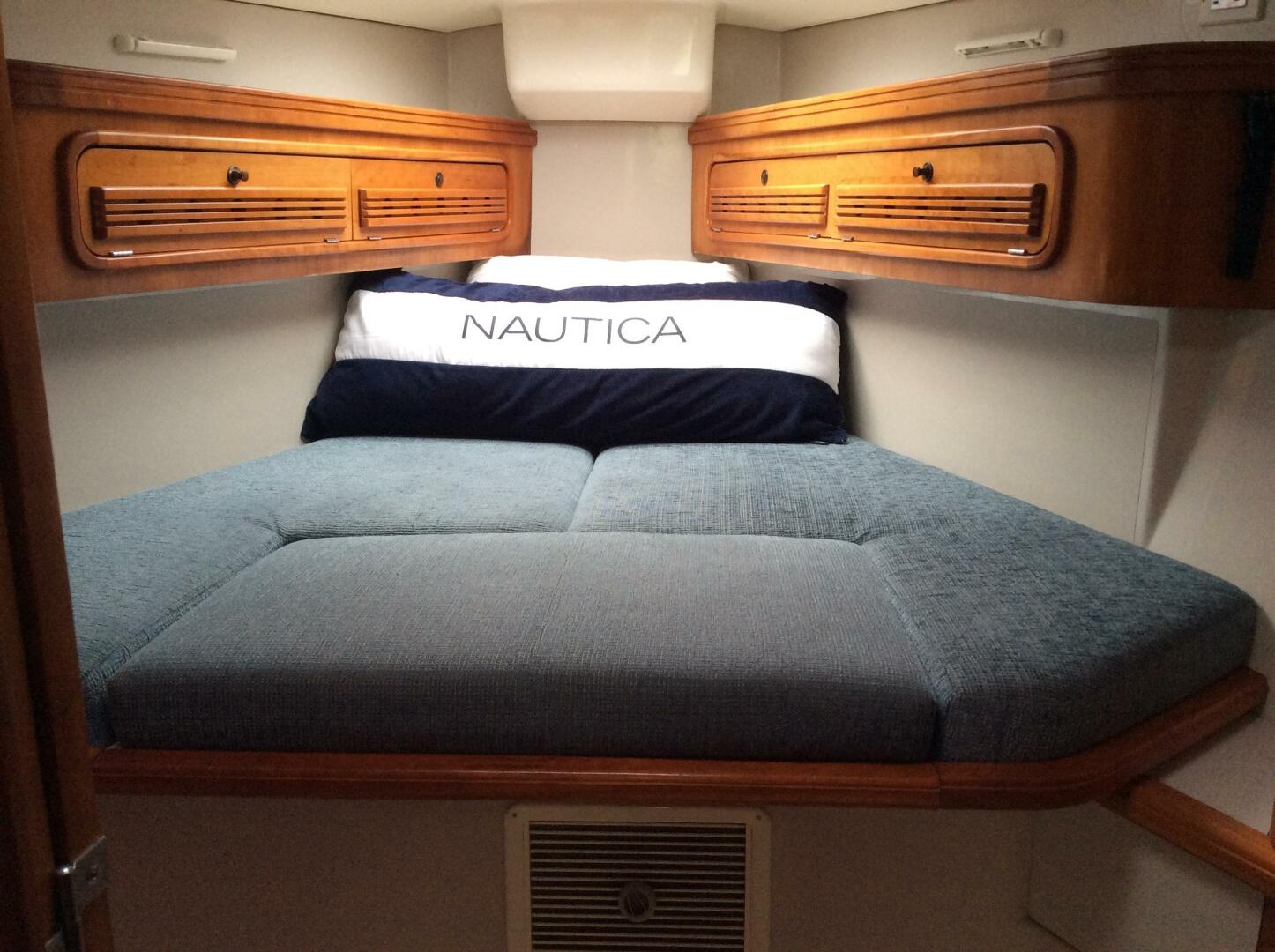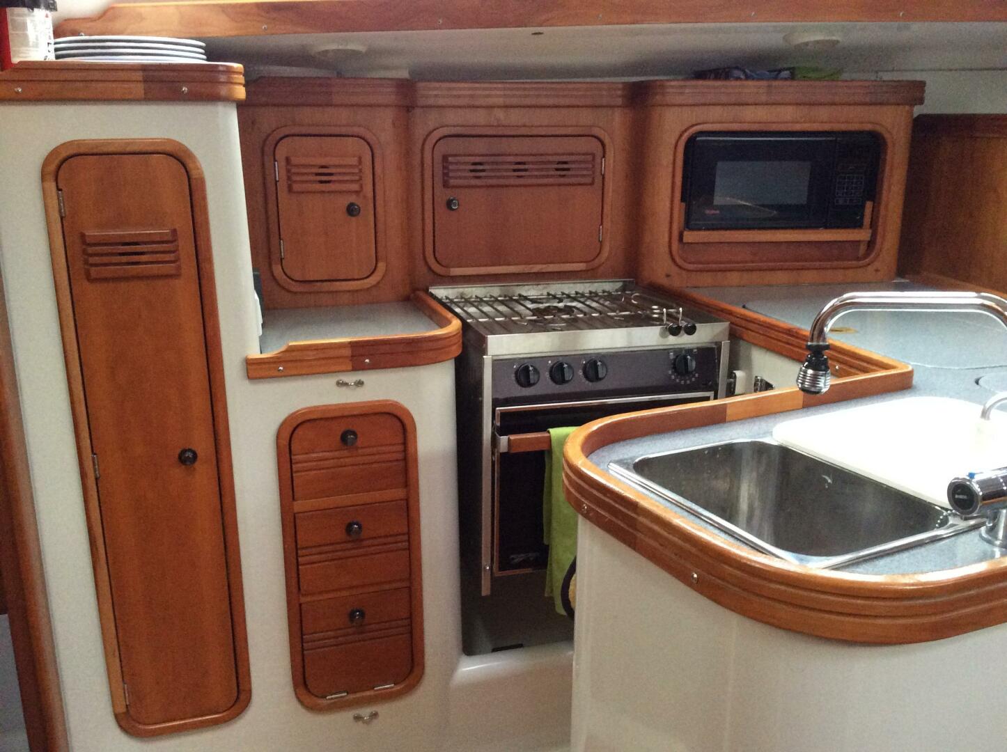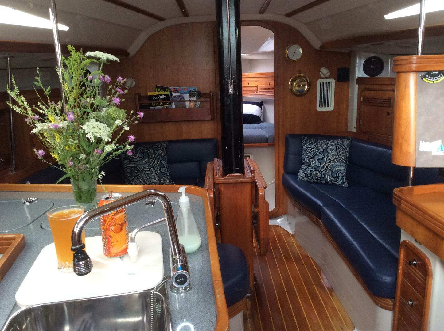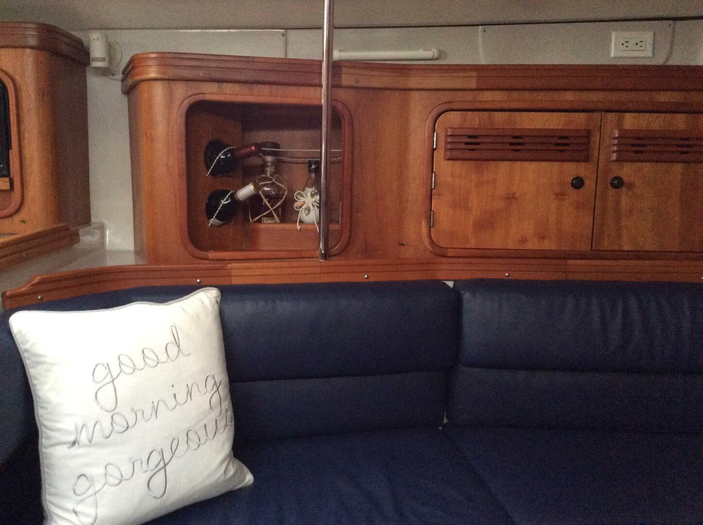 Forward cabin with double V berth, storage cabinets, and hanging locker. Main cabin with centerline folding table, settee berth/seating to port and starboard, outboard storage Lockers. L shaped galley aft to port. Nav station aft to starboard, with head located aft to starboard of Nav station. Aft cabin with double fore and aft berth and separate hanging locker is accessed to port of the companionway. Teak and holly cabin sole. Varnished cherry cabinetry and joiner work throughout.