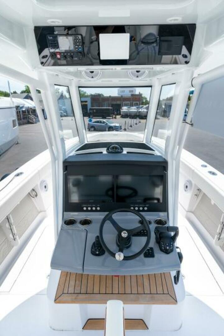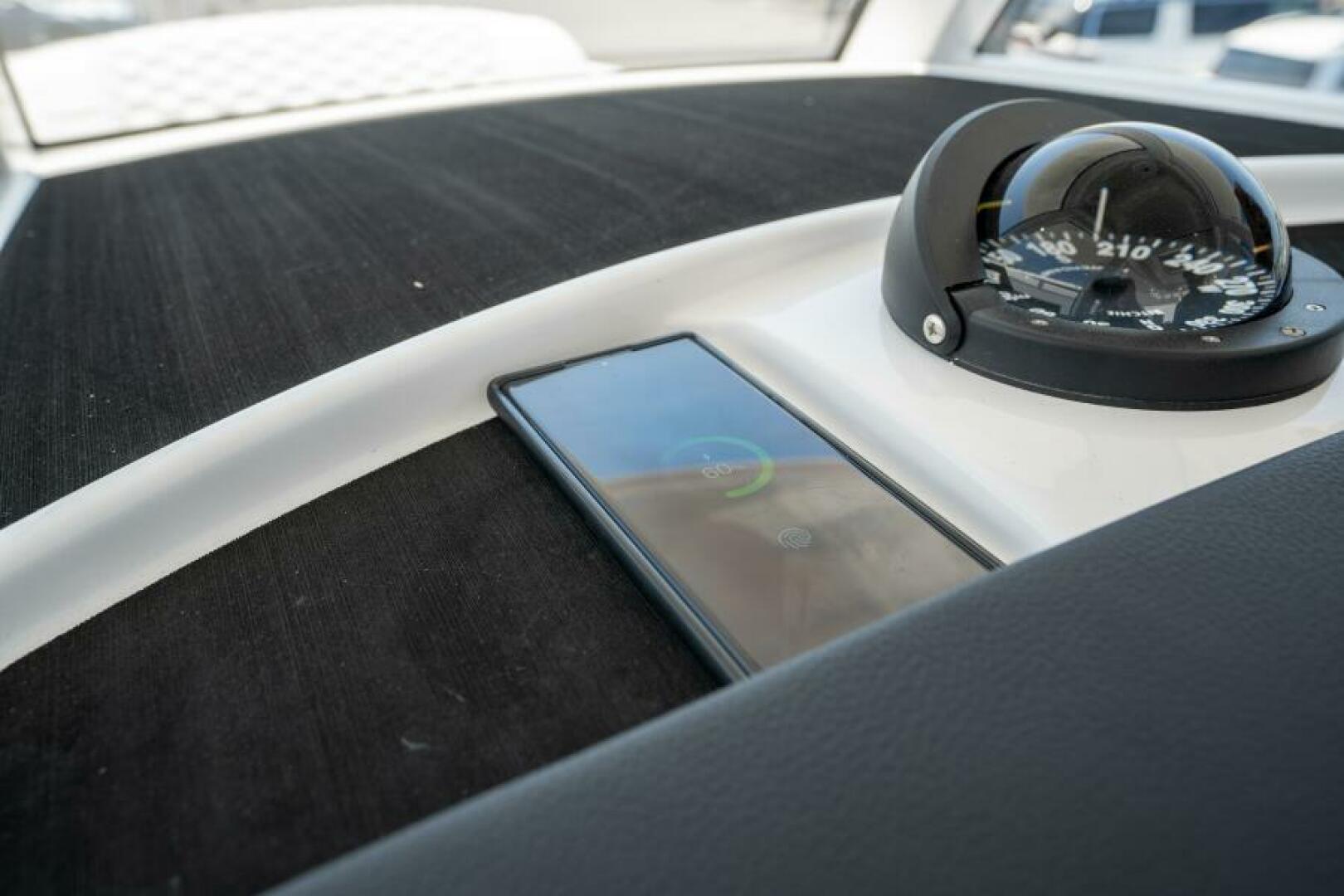 - Wireless phone charging, integrated VHF systems, and ergonomic helm layout.
