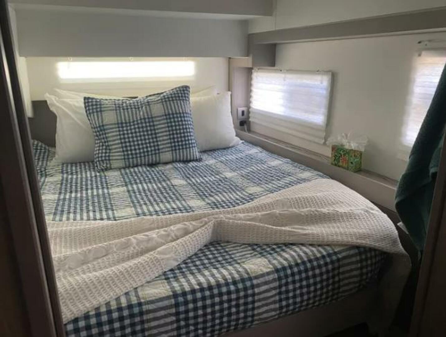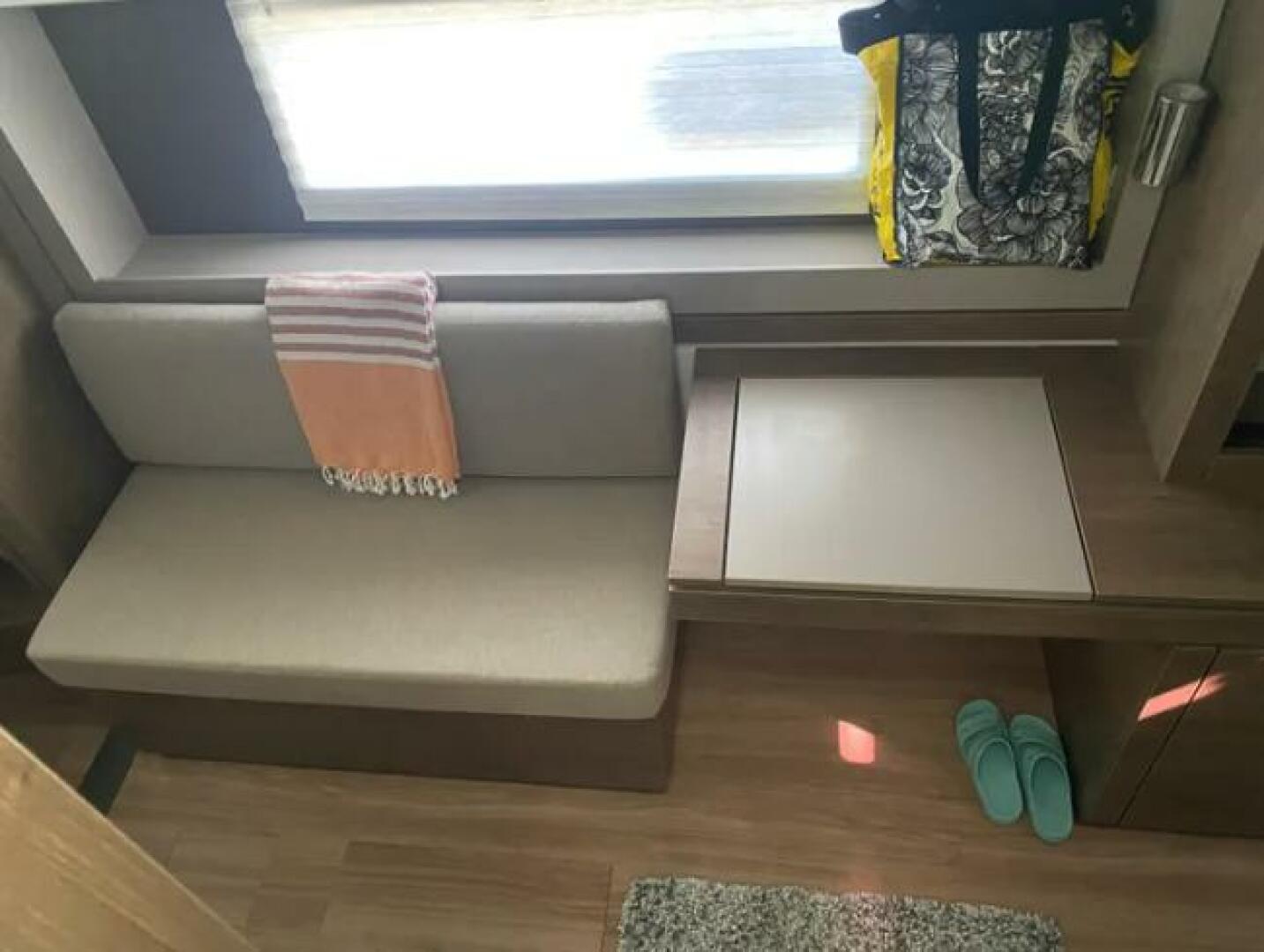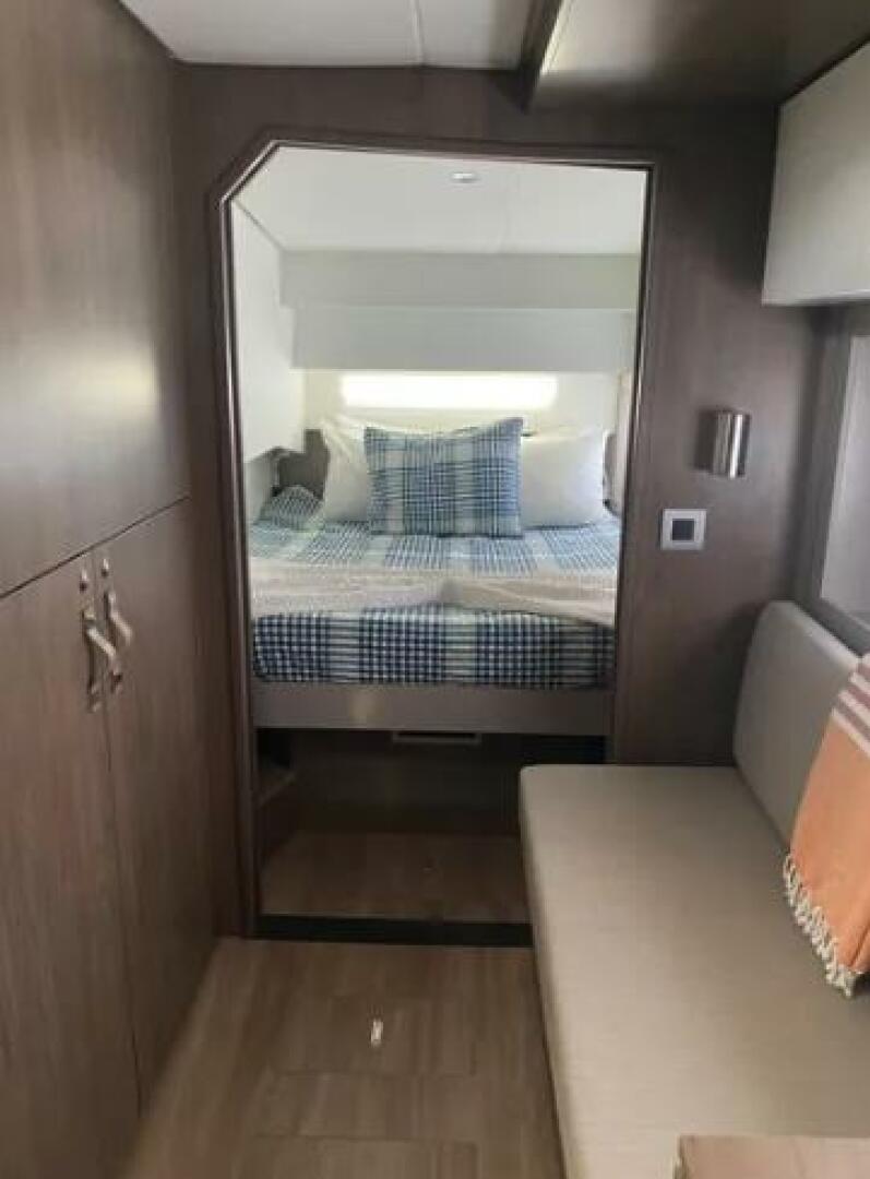 Nauti Habit is configured in the Owner's Version layout, dedicating the entire port hull to the master suite. This stateroom features an island bed accessible from both sides, a couch, a vanity and desk, and a large private bathroom with a separate stand-up shower stall. The starboard hull contains two guest cabins -- one with an island bed and one with a double berth -- each served by its own dedicated head with shower. The three-cabin, three-head arrangement is a meaningful advantage for charter use or cruising with family and friends, eliminating the shared-bathroom compromises common on smaller cats.