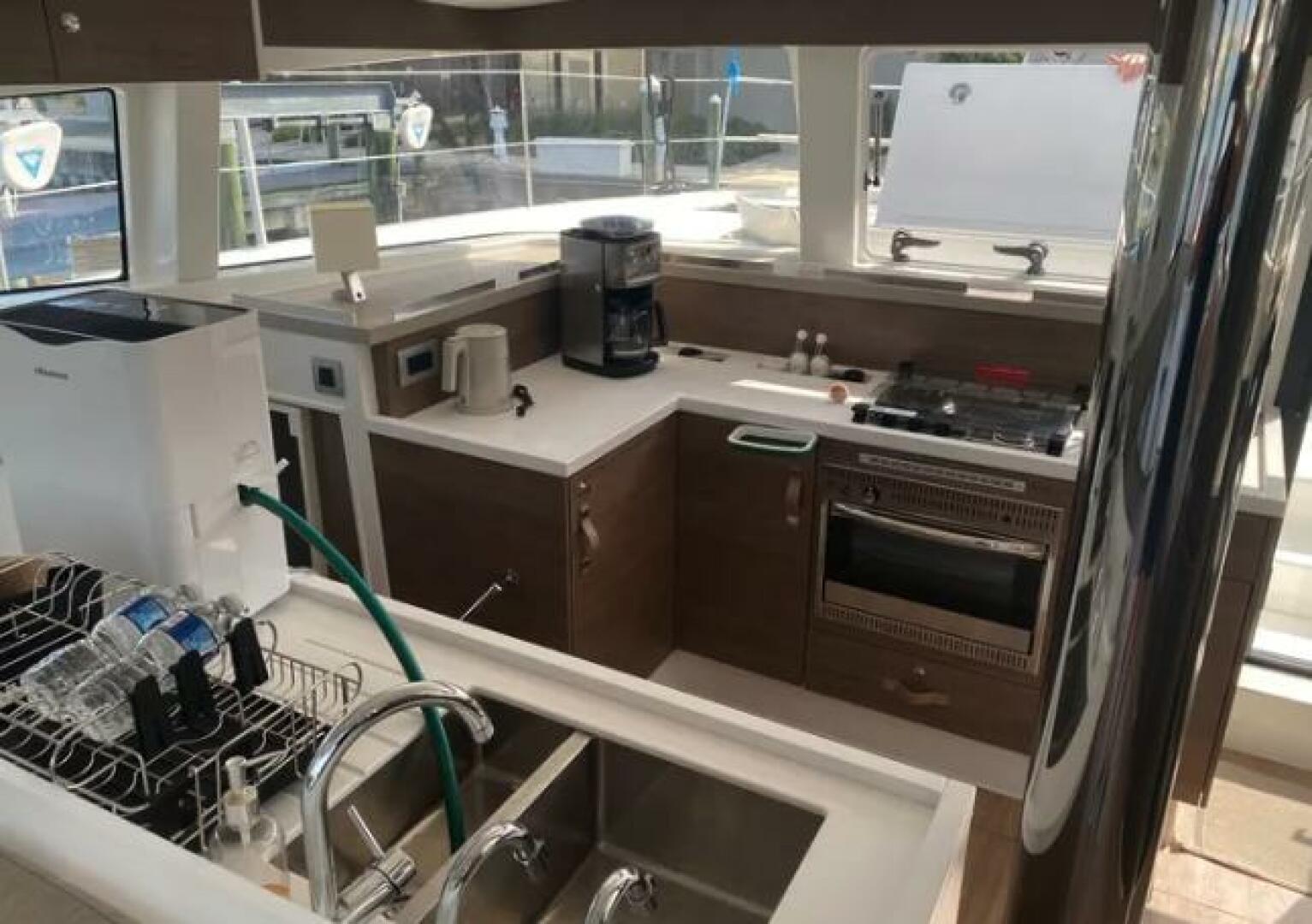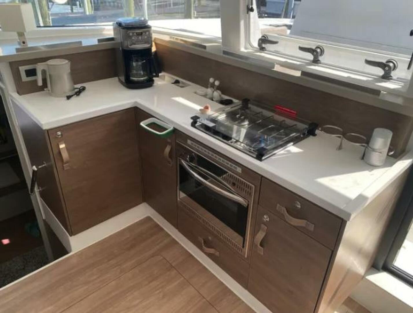 The galley runs along the starboard side of the main saloon, open to the living space and positioned to take full advantage of the garage-door opening to the cockpit. It is well-specified for passage cooking and extended provisioning.
