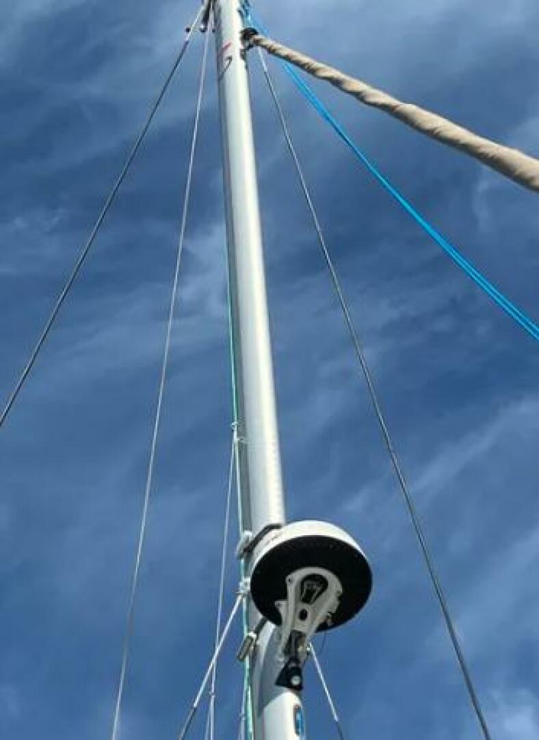 As a sailing catamaran, the Bali 4.2 carries a conventional sloop rig suited to short-handed offshore sailing. The mast is stepped on the bridgedeck and supports a fully-battened main and furling headsail. The masthead location also hosts the FLIR M232 camera and downward-facing cameras that support docking and anchoring.