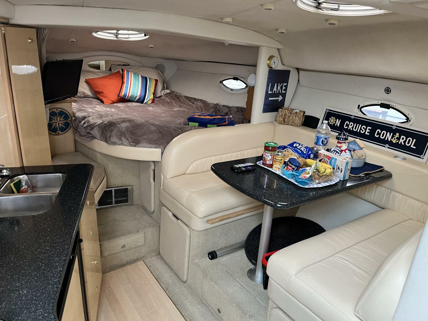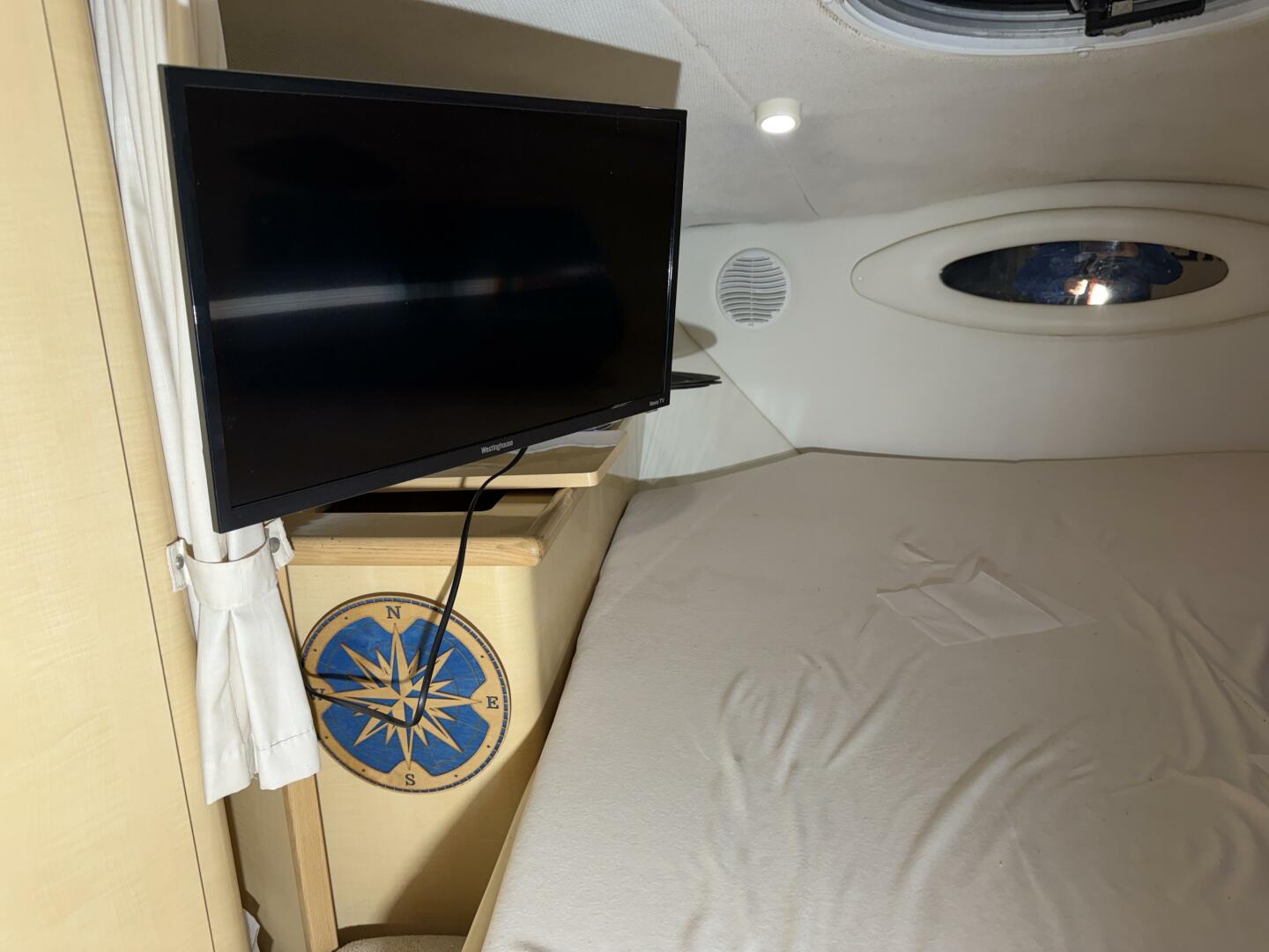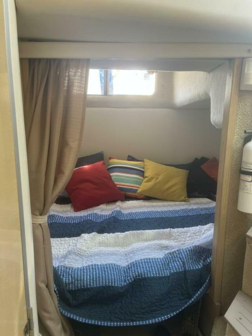 Below deck, the cabin is well-appointed with a two-burner electric/alcohol stove, microwave, refrigerator, and a new 19” television. The VacuFlush head system provides convenience and reliability, and recent upgrades include new duckbills in 2024. Comfort has been enhanced with brand-new memory foam mattress toppers and tasteful decorative touches throughout.