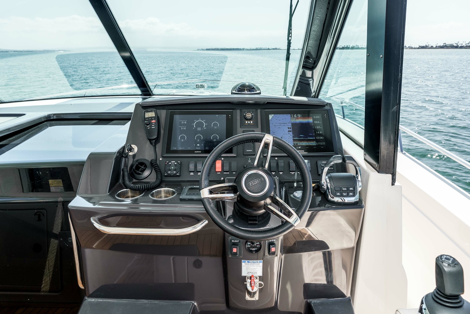 - Volvo® Glass Cockpit electronics package with Volvo® engines: Two Volvo®/Garmin® 8212 12" displays with card reader and GRID remote, Volvo® autopilot, Volvo® IPS Joystick Plus control, Joystick driving, GPS antenna, Garmin® 24" HD dome, Garmin® VHF200 radio, Garmin® GSD24 sounder, 600w transducer