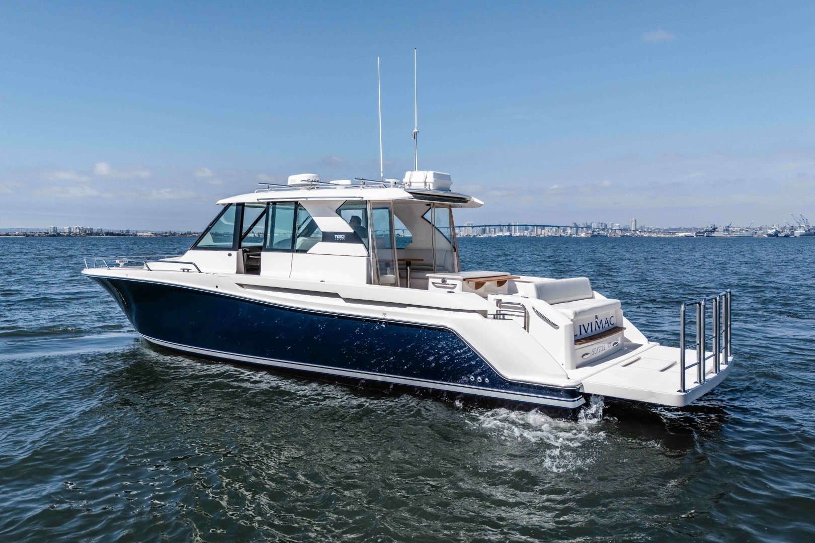 2016 Tiara Q44 Express Cruiser "LIVIMAC" for sale in San Diego, California! The Q44 is the ultimate day boat with it is unique extended overnight capabilities. Built on the robust hull shared with the successful coupe model, LIVIMAC offers many options for family recreation and entertainment. The single level main deck is a huge hit and provides maximum safety for all ages moving around the boat. This is truly the most optioned Q44 ever built by Tiara including: