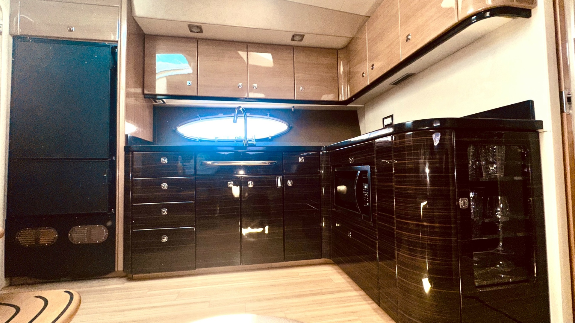 - L-shaped galley w/high-gloss Deep Cherry finish cabinetry, dovetailed hardwood drawers, full Corian countertop, double-bowl stainless steel sink w/swivel faucet, 2-burner electric stove w/flush Corian cover & safety shut-off switch, exhaust fan, brushed stainless steel convection/ microwave oven, Krups® coffee maker, 120V/12V upright refrigerator/freezer w/brushed stainless panels & concealed in-counter trash container