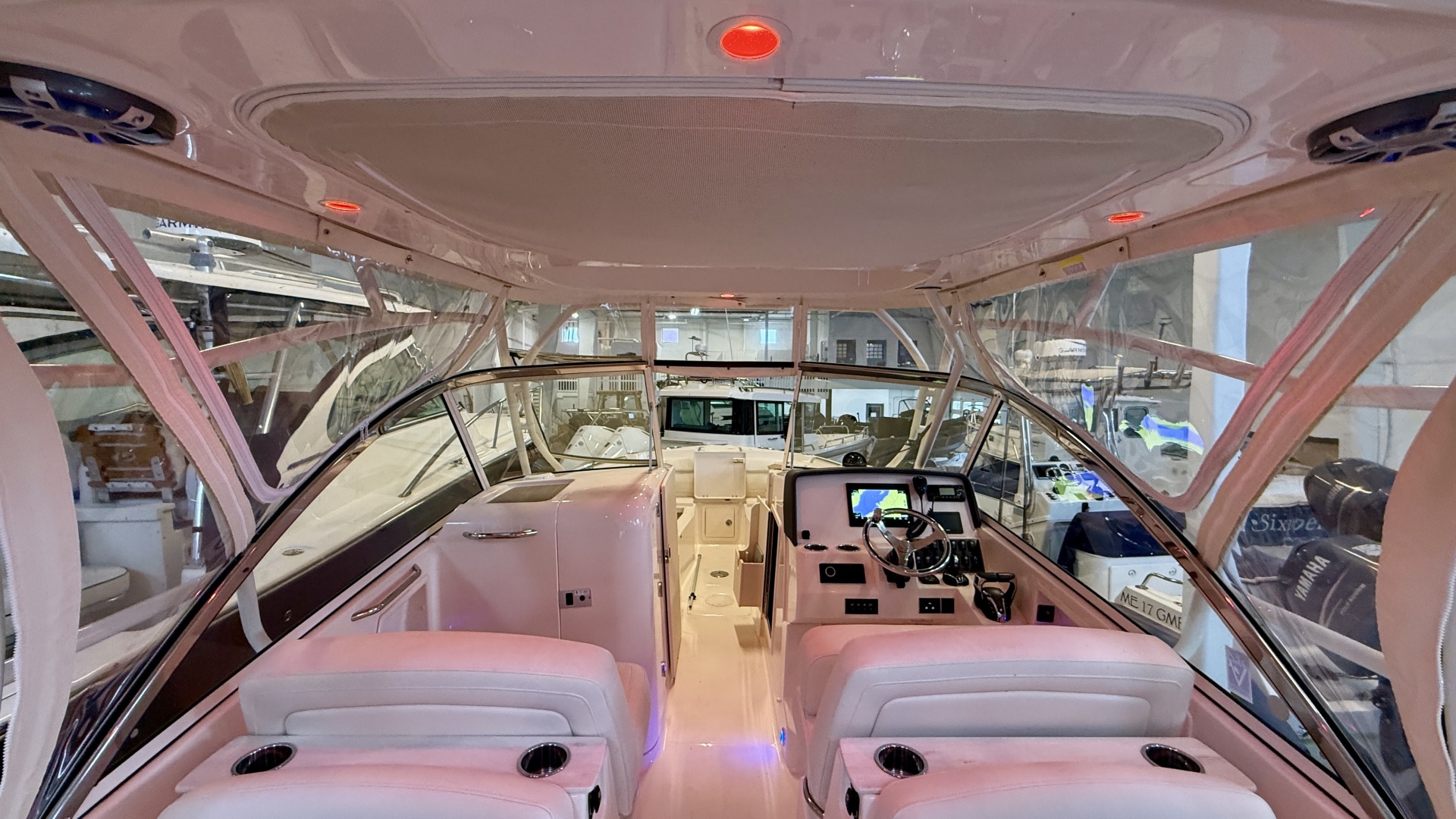 - Hardtop w/painted aluminum frame, storage net, speakers (2 in lieu of helm), LED spreader lights, tri-colored (red, blue, white) LED recessed lights (4), side mounted rod holders (4), outrigger plates, & front and side curtains (ivory)