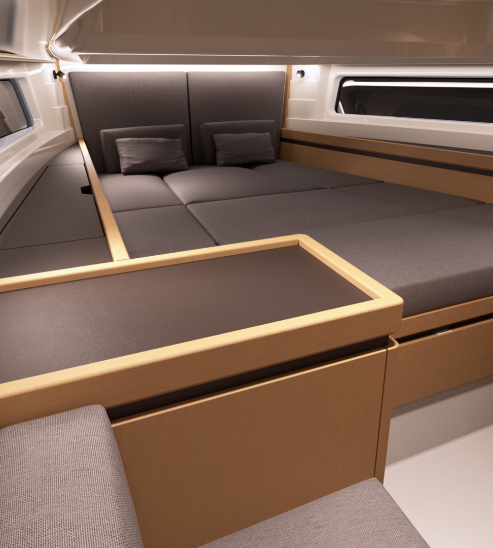 The modular design of the Wayfinder 38 gives boaters exceptional flexibility to adapt their boats to changing needs, even years after purchase. With this innovative approach, you can, for example, transform the bow area from a large sofa unit into a sun bed, reconfigure the aft area from a wetbar to additional seating, or convert the cabin from a closed configuration to a sun-top. This level of customization ensures your boat evolves with your lifestyle, offering functionality and versatility like never before.