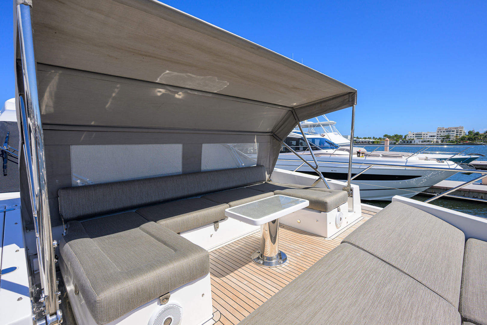 Docking and maneuvering are effortless thanks to the cockpit docking station, bow thruster, and electric mooring winches. Teak side decks provide both elegance and safety, while the Seakeeper stabilizer ensures a smooth and comfortable ride in all sea conditions.