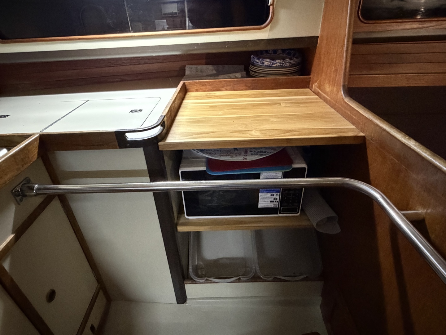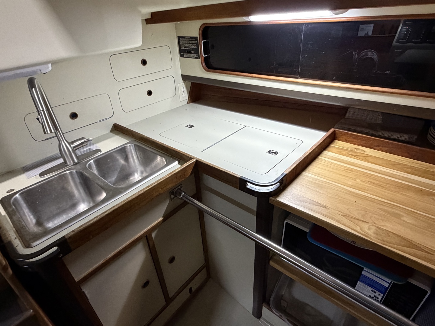 - Galley with newer faucet, stainless sink and microwave (propane oven removed)