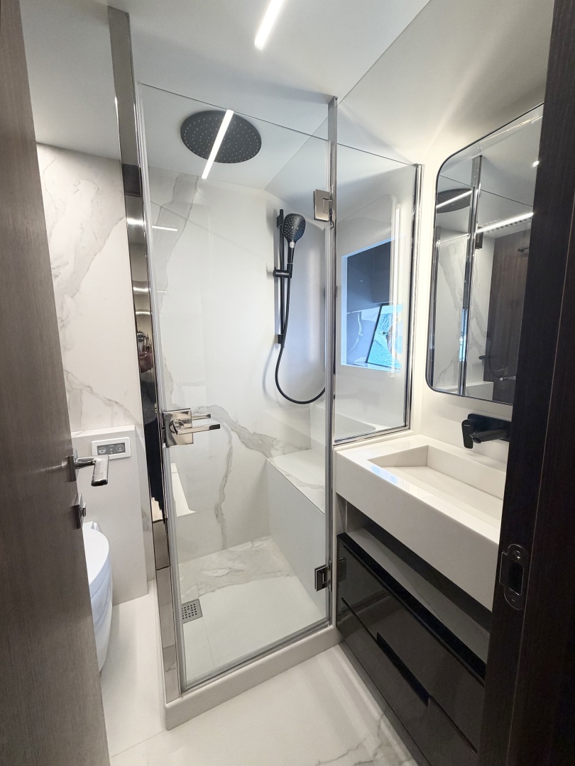 With four luxurious staterooms, three heads, and a dedicated crew cabin that sleeps 2, the 66 Flybridge offers generous space for you and your guests to relax in total comfort. The interior upgrades are countless. Italian leathers, luxury interior wood finishes including stunning smoked oak cabinetry and Madagascar ebony custom furniture pieces, LED lighted wall at the stairway connecting the salon to the lower staterooms, white leather headboards, generous use of mirrors and upgraded stones. Enjoy a flybridge with double grill, open-air dining, an additional fridge/freezer in the galley, and a wine cellar for those special occasions.