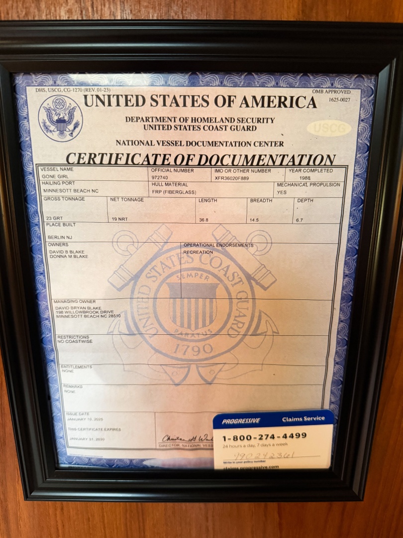 The 2023 survey confirms excellent overall condition, clean machinery spaces, and a vessel that has been continuously upgraded by a knowledgeable owner. If you're looking for a classic Carolina-capable convertible with modern diesel power and updated systems, GONE GIRL stands out as one of the best values on the market.