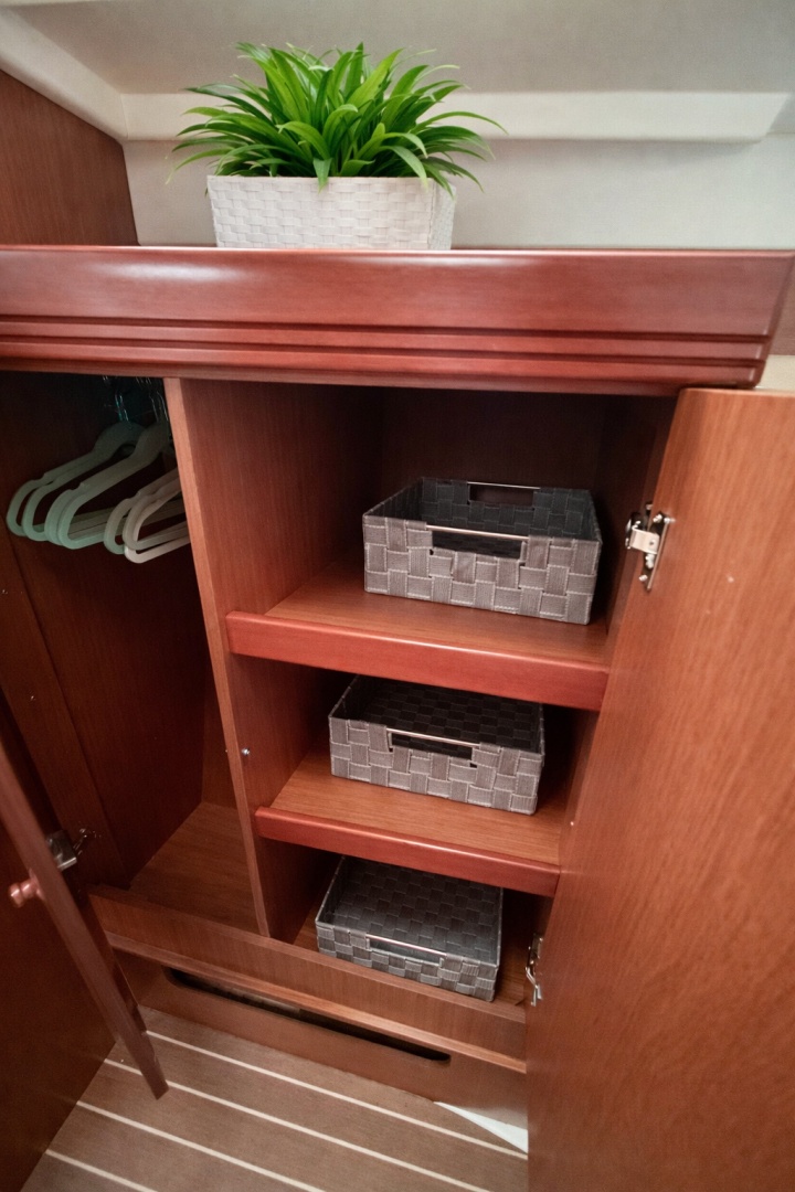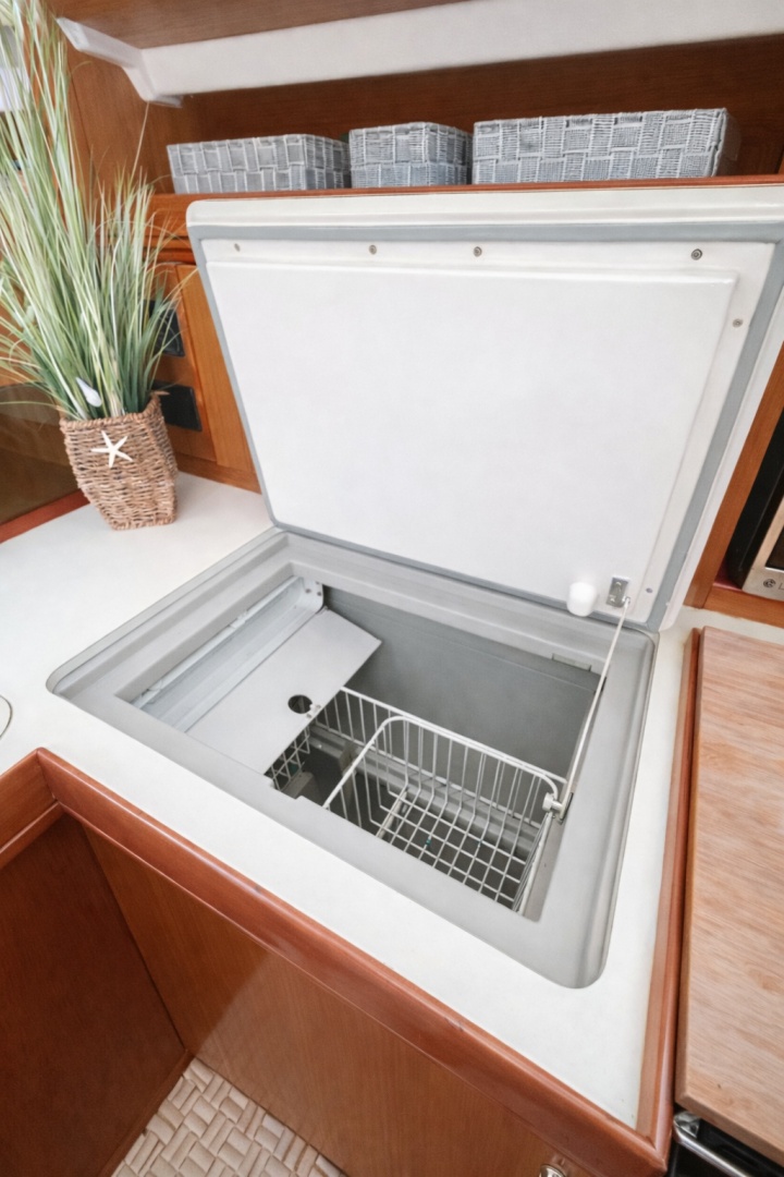 This 2007 Jeanneau 42i features a two-cabin, two-head layout with an owner’s cabin forward and a separate head, along with a spacious aft cabin equipped with hanging storage lockers. The main salon converts into an additional queen-size berth, providing flexible sleeping accommodations. To starboard, the large galley is outfitted with a two-burner propane stove and oven (with two propane tanks stored in an external locker), a top-loading refrigerator and freezer, and a microwave. Forward of the galley is a large dining table with ample seating, while a navigation station is located to port. Both forward and aft heads include marine toilets, a pressure hot and cold water system, and two holding tanks, with the aft head featuring a separate stand-up shower compartment.