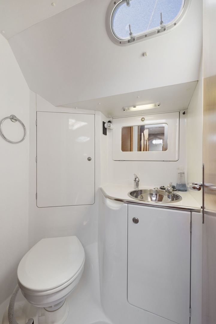 The master stateroom is all the way forward with a centerline queen berth. It has a vanity/computer desk, hanging locker, storage cabinets and book shelves along the side of the berth. The head has a shower stall and an electric toilet.