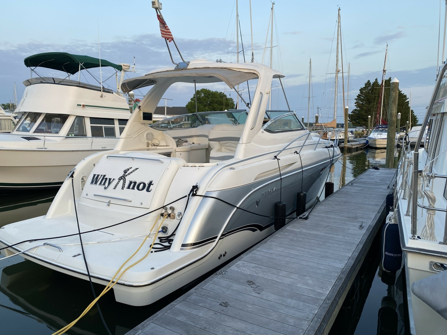 - Molded transom trunk w/pneumatic lifts, fender storage, storage for cockpit tables & cushions 120V shorepower w/ galvanic isolator & two 30-amp cords Polished stainless shorepower, cable TV & phone inlets & chrome-finished city water inlet