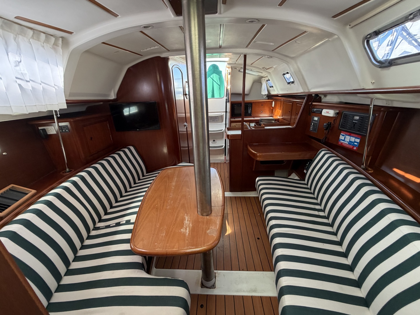 - Her interior is warm and accommodating with a faux teak sole for easy maintenance, mahogany bulkheads and cabinetry that was varnished by Hinckley Yacht Yard in 2018, and a sporty green and white striped fabric. Her interior is also light, bright and very inviting. Her Air-conditioning is a bonus addition for those hot August nights.