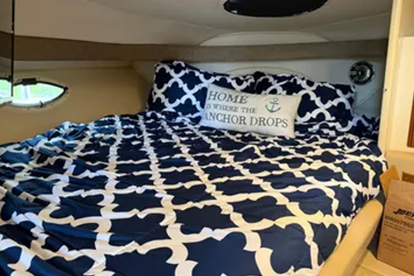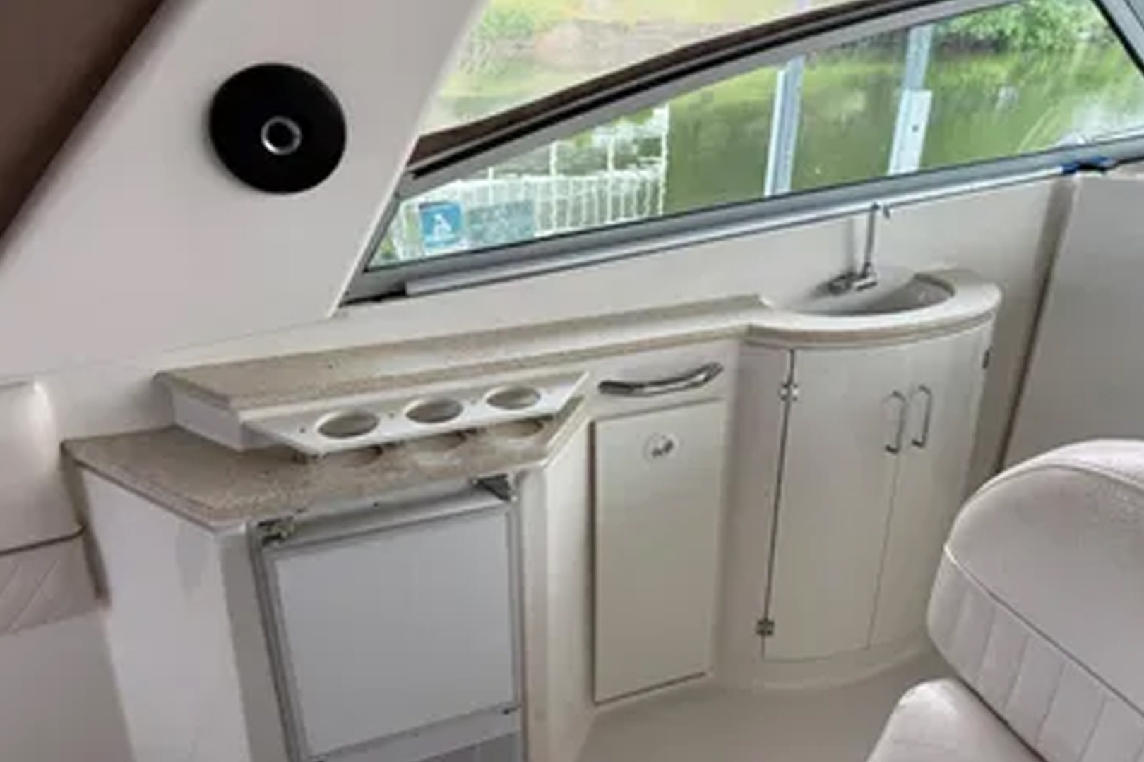 Open plan cabin boat. Large L shape dinette sofa. Spacious forward berth. Full service galley with microwave, and coffeemaker. Three overhead hatches, and five opening ports provide good cabin ventilation. Well designed cockpit has wraparound lounge seating aft, wet bar, and double wide helm seat. Note walk through windshield and aft fender storage. Twin Volvo Penta 5.7 GSi sterndrive power. Kohler generator, 5kw. Full canvas camper enclosure and ice maker complete the cockpit space.