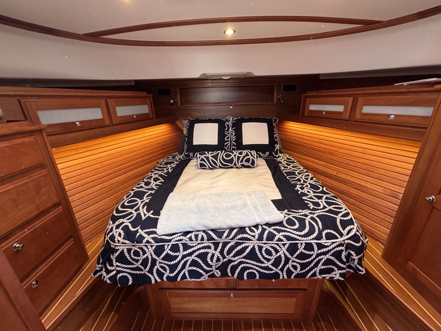 The Sabre 45 Salon Express offers two staterooms with two full heads and a salon that flows down two gentle steps to a bright half-up galley. Her unique proposition is the utility space located between the engine room and the guest stateroom. This space is reserved for the installation of optional accessories like washer/dryer units, additional freezers, or wine chillers. By creating this working space all storage areas within the vessel have been preserved, and her cruising accommodations feel like those of a much larger craft.