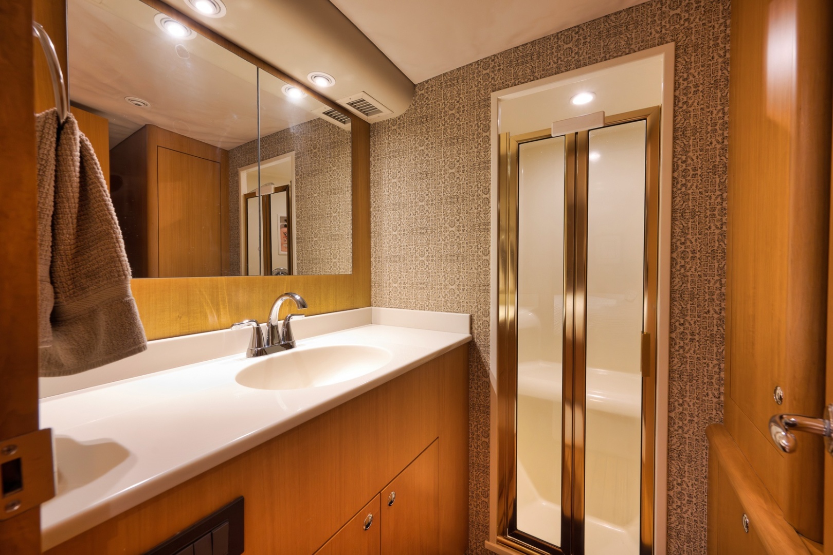 -Two recessed lights in soffit above vanity