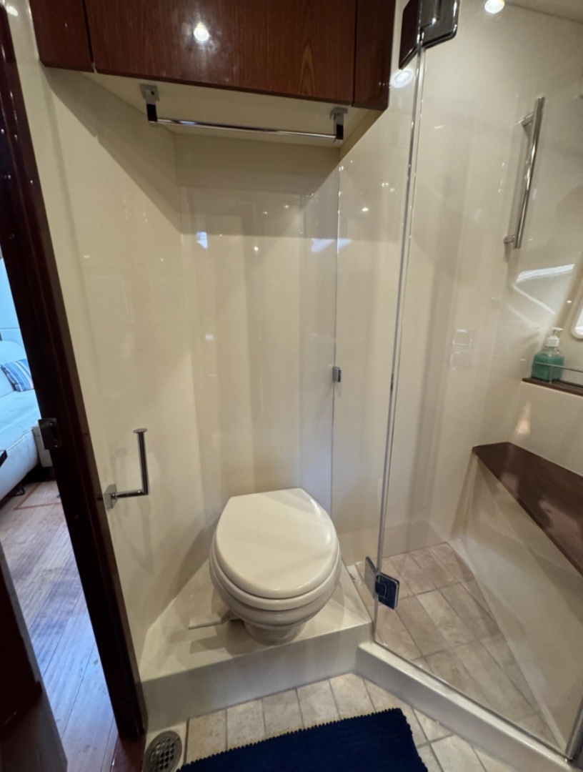 This is the standard two-cabin, two-head layout, which in my view is the right one. Forward island berth, large aft master, good separation between cabins, and a lower salon and galley that feels open instead of buried. Up top is where this boat really earns its keep, with a protected social space that works far better on the West Coast than an open express cockpit that only works on perfect days.