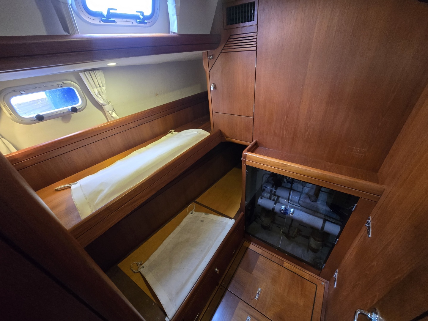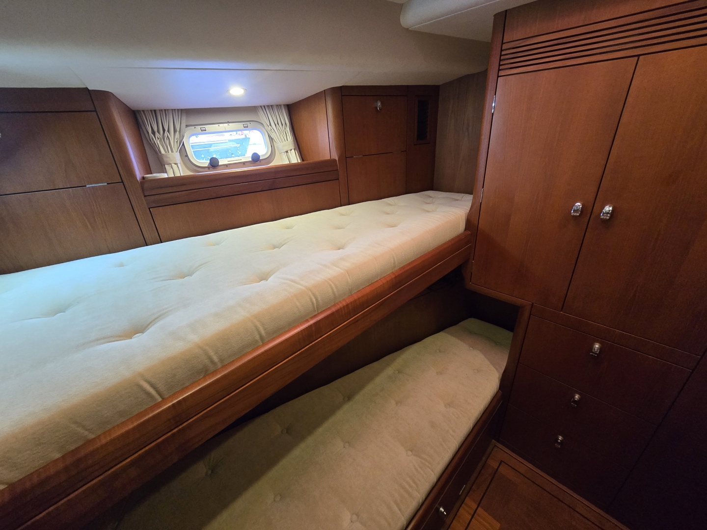 Starboard Aft Cabin: Upper and lower berths with storage and hanging locker, also providing access to systems and engine room, making it a practical and functional guest or crew cabin.