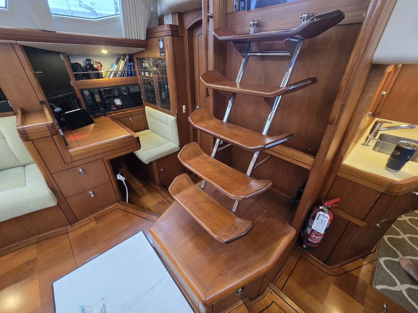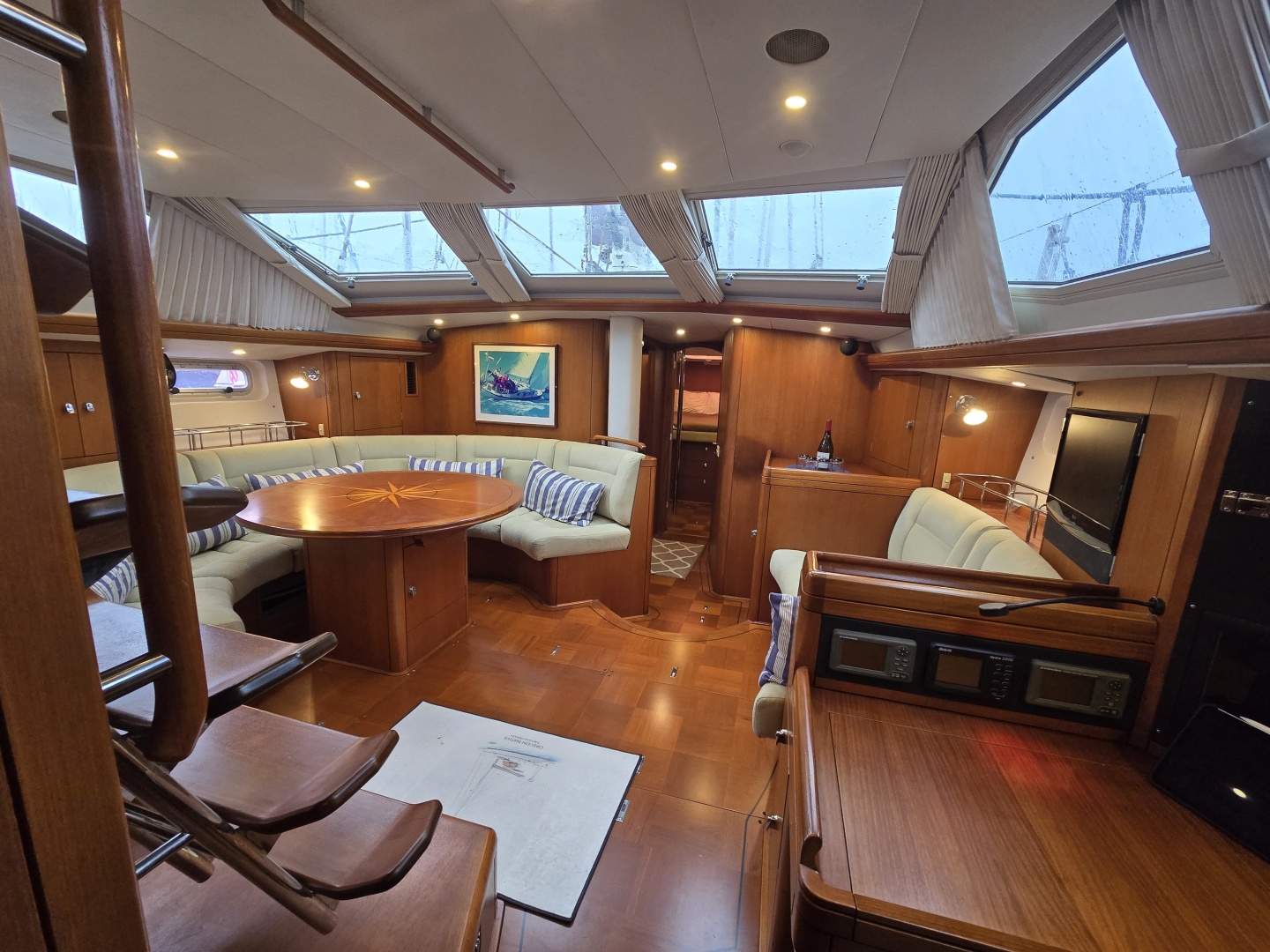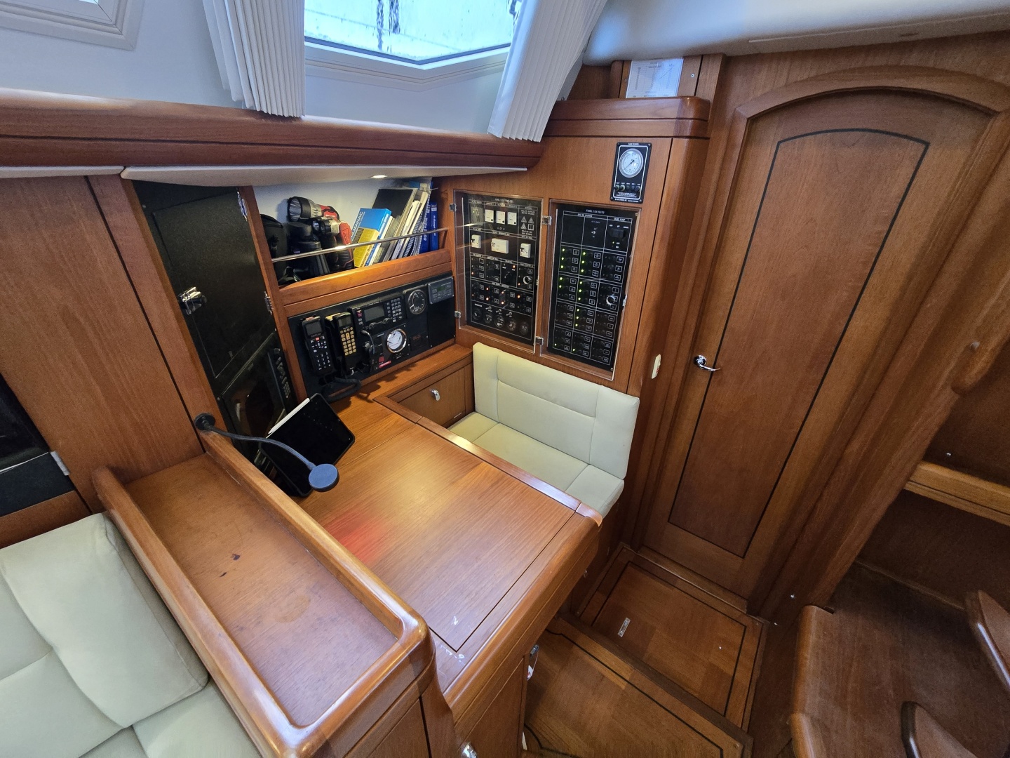 - Navigation Area: Forward-facing chart table with integrated instrument panels and storage