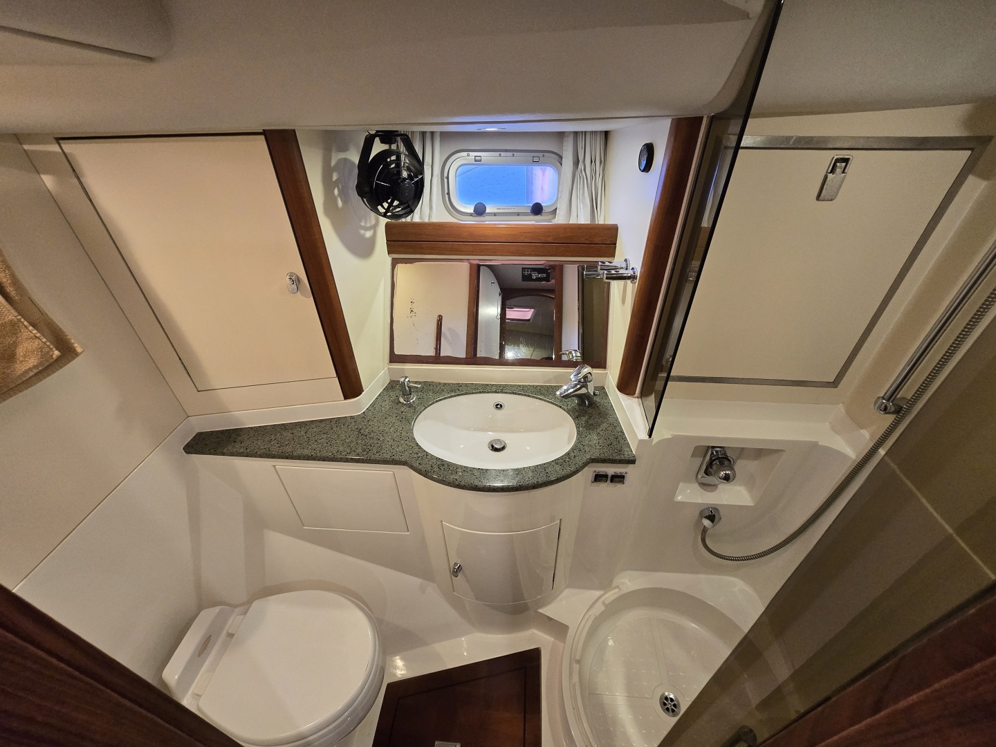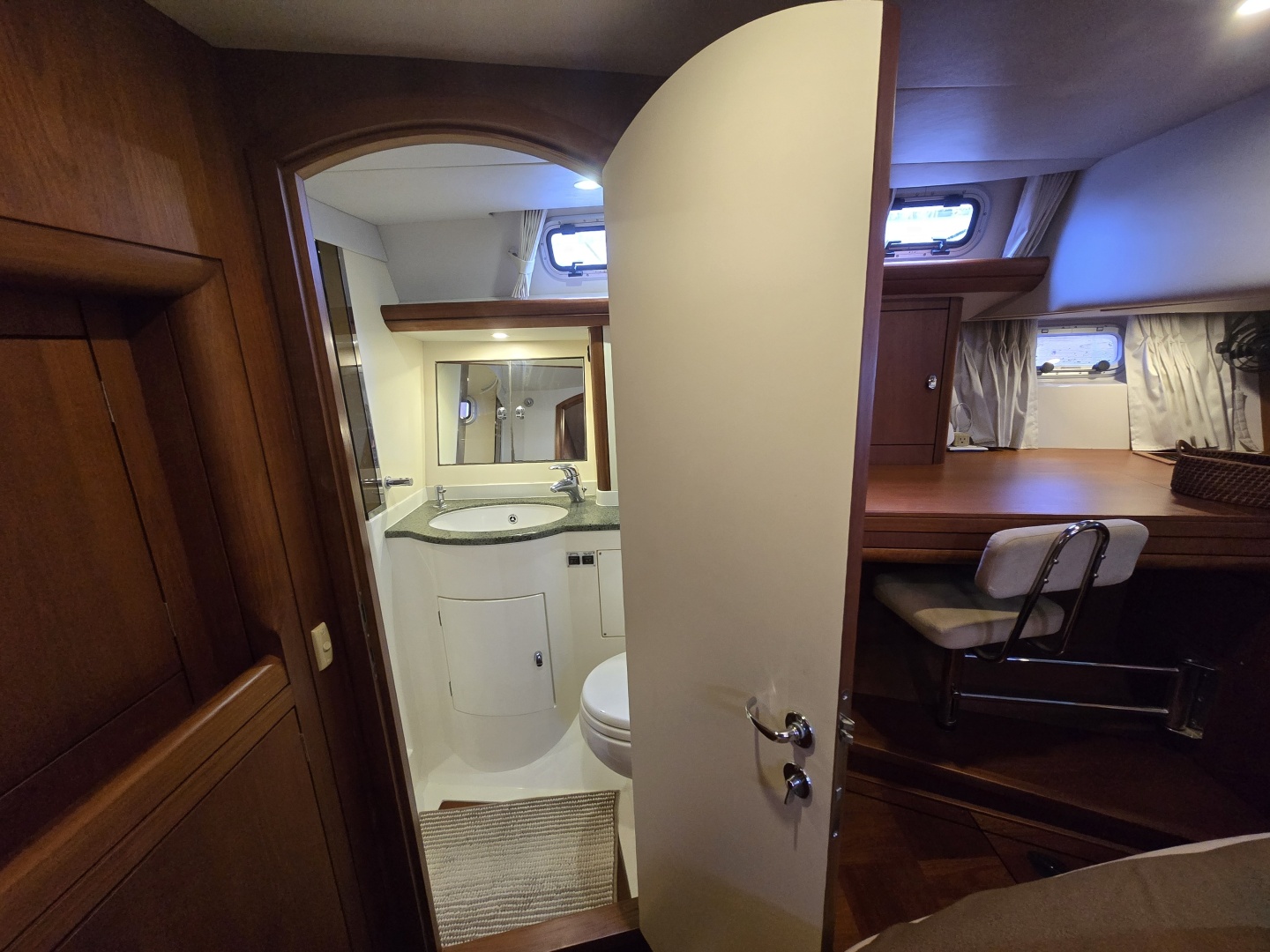 Forward Head: Located just aft of the VIP cabin, featuring a VacuFlush toilet, wash basin, and separate shower stall and holding tank.