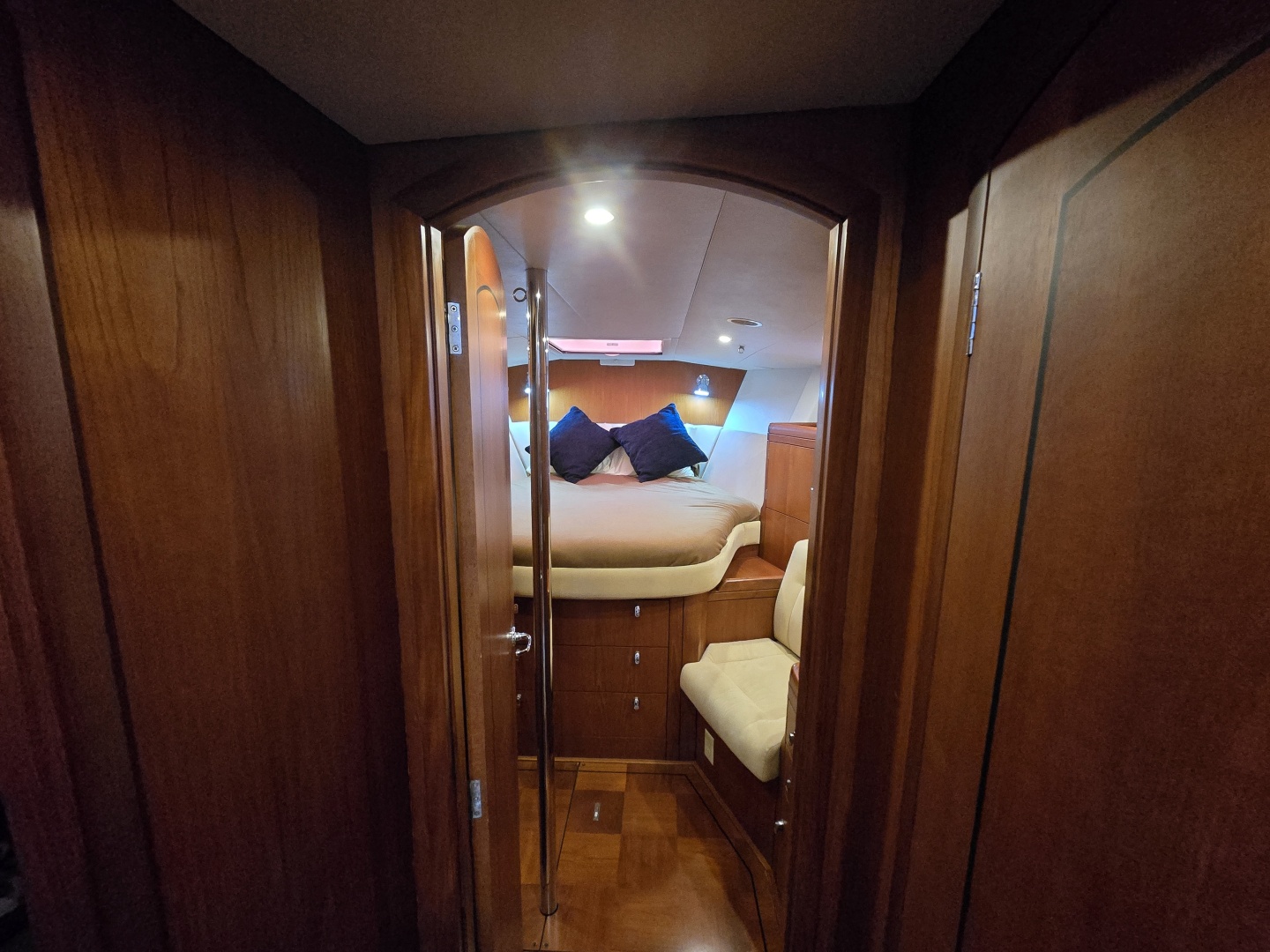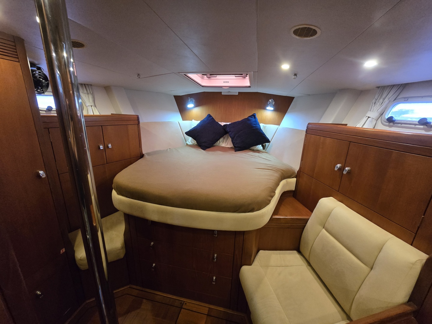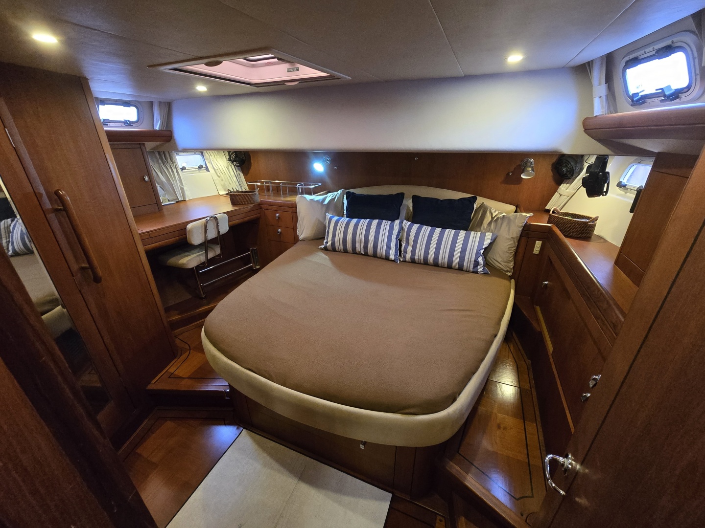 Forward VIP Cabin (Forepeak): Centerline island double berth with excellent storage throughout, including hanging lockers and drawers, plus good natural light and ventilation from overhead hatch and ports.