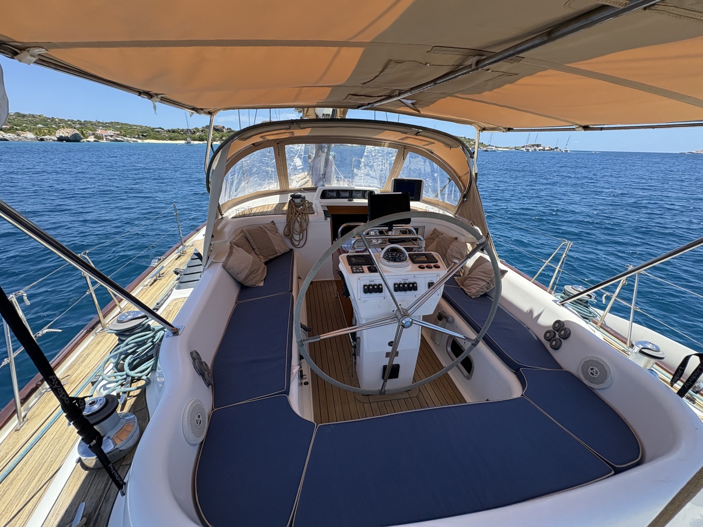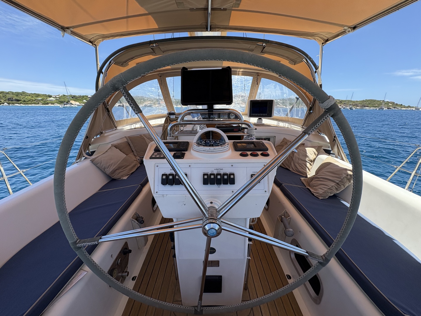 - Cockpit Electronics: Secondary B&G 12” display at companionway, remote windlass control, bow thruster joystick control, and engine control panel at helm