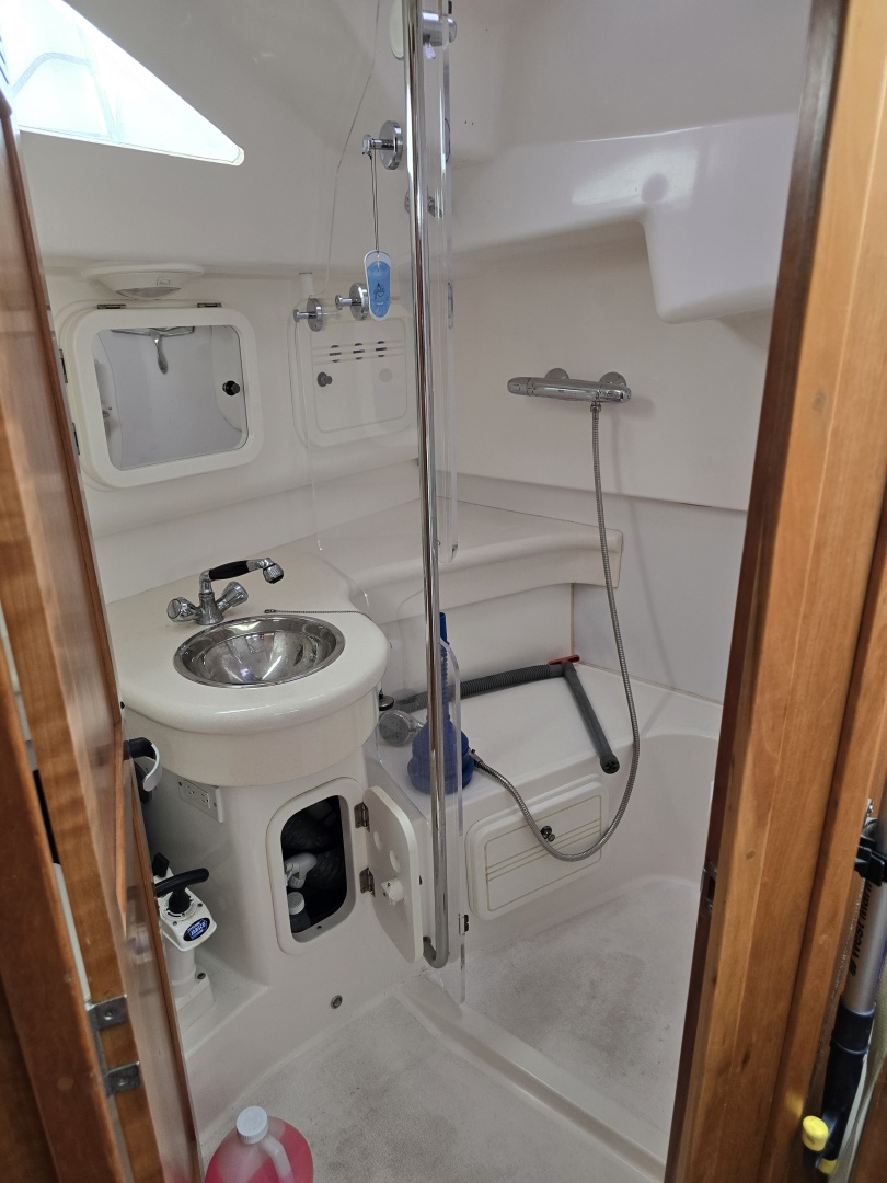 Aft and to starboard is the head with separate stall shower with folding Lucite shower door, vanity and Jabsco marine toilet with holding tank.