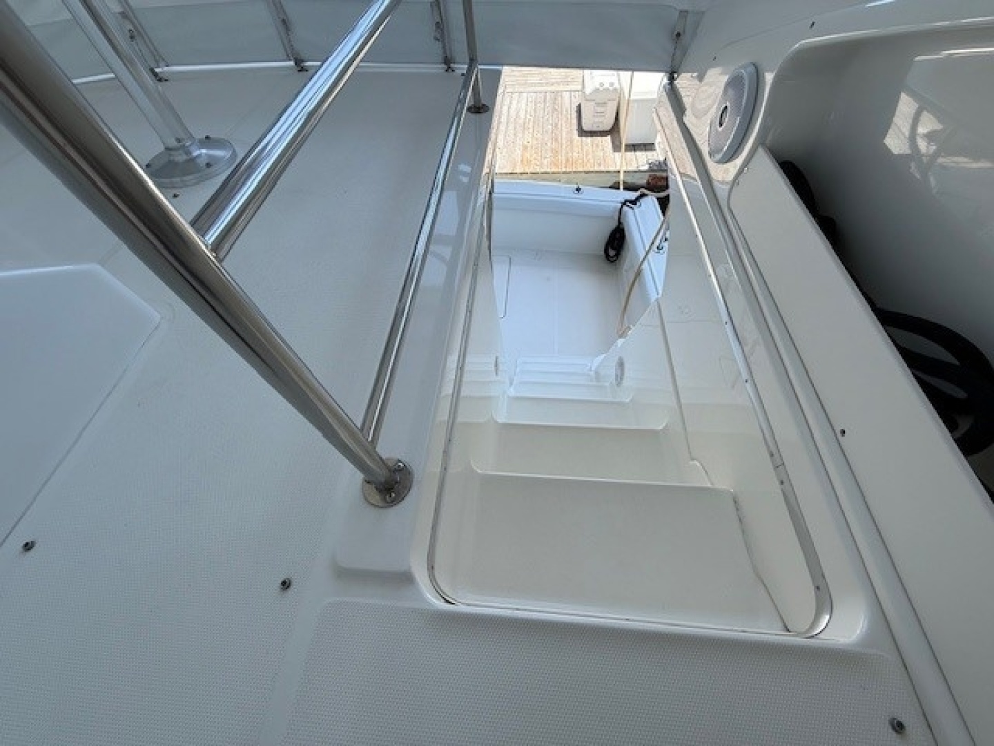 The cockpit is very large for entertaining or fishing activities and has a large transom door located on the starboard side for easy access to the swim platform on the transom. A hot/cold shower is located in the cockpit next to the transom door. There is a removable rocket launcher/rod holder in the center of the cockpit and tackle drawers and sink are located forward on the starboard side of the cockpit. There are rod holders located in the gunnels and overhead on the aft bridge railing. The 50 amp shorepower cord is located on the port side and has an electric Glendenning Cablemaster system. There is a large access hatch in the aft portion of the cockpit that has a lift out storage bin with direct access to the lazarette beneath. Another hatch located forward in the cockpit offers direct access to the engine room and the lazarette. Molded in fiberglass steps port and starboard lead to the wide non-skid sidedecks offering passage forward to the bow.