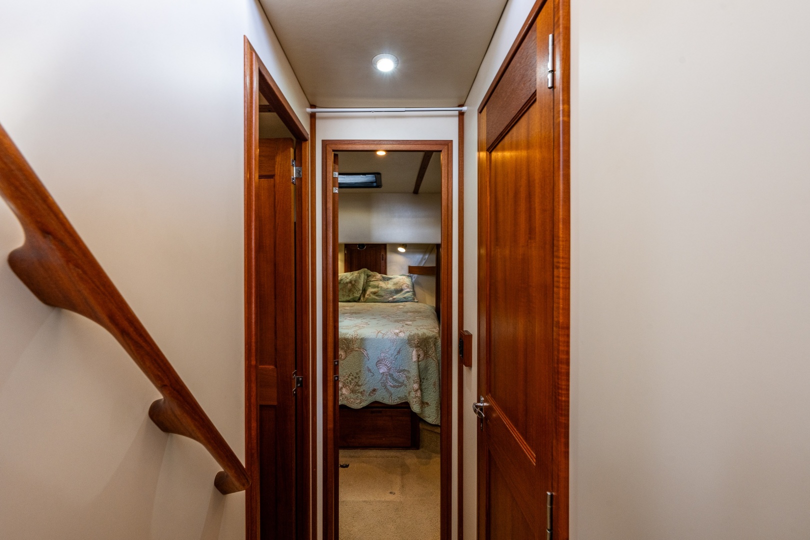 Stepping into the salon from the cockpit you find a large L-shaped settee to port and the galley to starboard. Up a few steps into the pilothouse, with sliding doors to port and starboard and a well appointed helm, the Nordic Tug is properly designed for cruising. Down from the pilothouse is the accommodations level. Forward is the primary cabin with a comfortable queen centerline berth. To port is the guest cabin with bunks making it a wonderful place for guests for those on water adventures. To starboard is the head with shower making a great space for extended cruising.