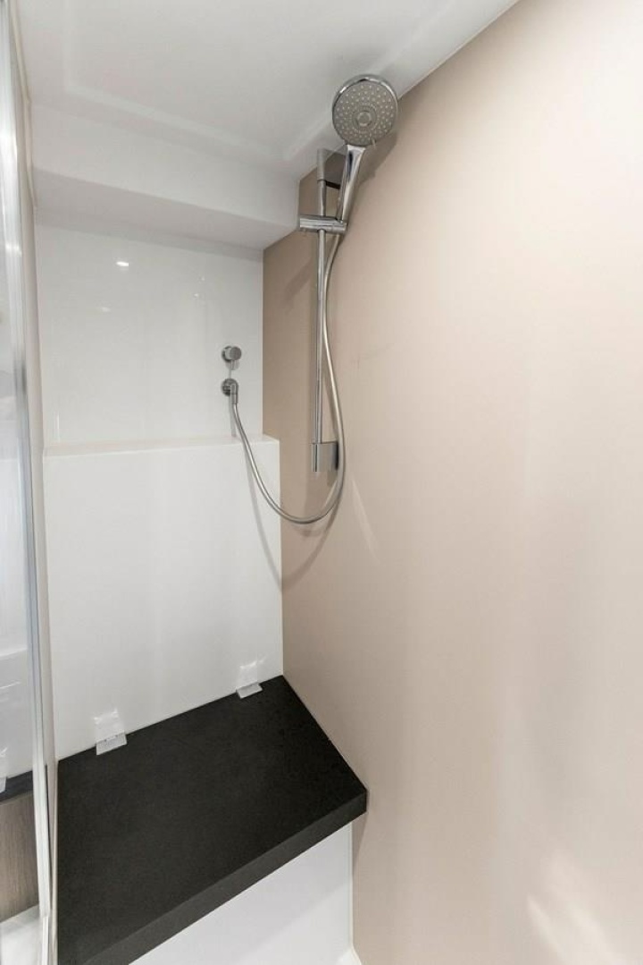 A generous beam accommodates the versatile second cabin. The large full-height side cabinet at the entrance can also be configured as a third bed, and the two twin beds can slide together to form a queen-sized bed.