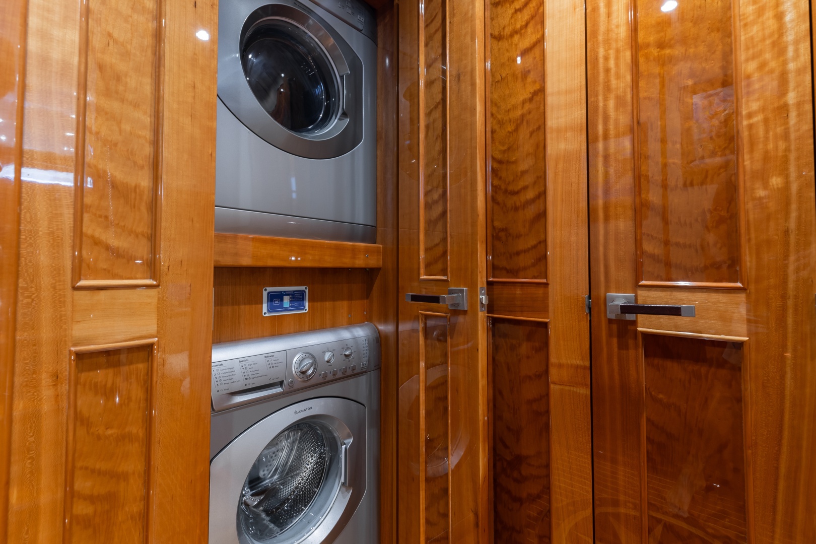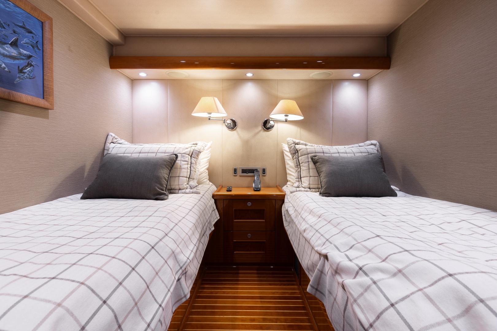 The three-stateroom, layout is configured for both comfort and privacy. The full beam master suite features a king-size walk-around bed, his and her private ensuite heads, and walk in closets. Two additional twin staterooms, each with their own private ensuite, ensure that guests enjoy the same standard of luxury throughout the vessel.