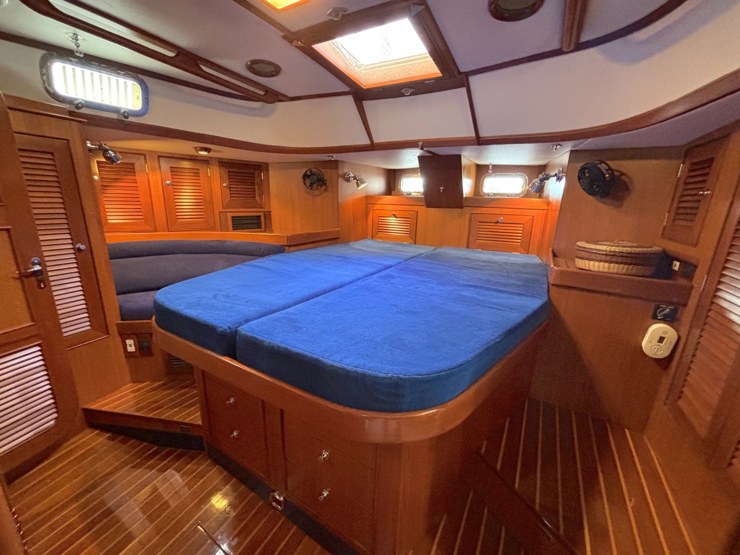 Windhorse is a very lightly used Hylas 49 with the traditional layout that allows access to the aft cabin from both port and starboard. She features the traditional teak and holly sole with blue Ultrasuede upholstery, louvered cabinet doors and a custom inlaid dining table. What is very event is the condition of all the teak surfaces. She looks like she is a 5-7 year old at best.