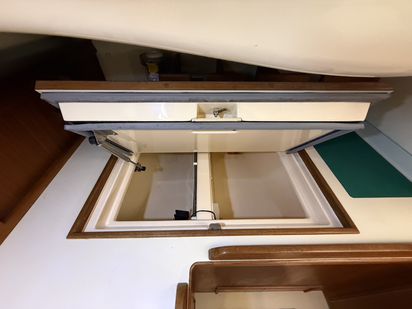 Aft Cabin: Features a large athwartships double berth with custom mattress and ample storage lockers, and easy access to the engine compartment.