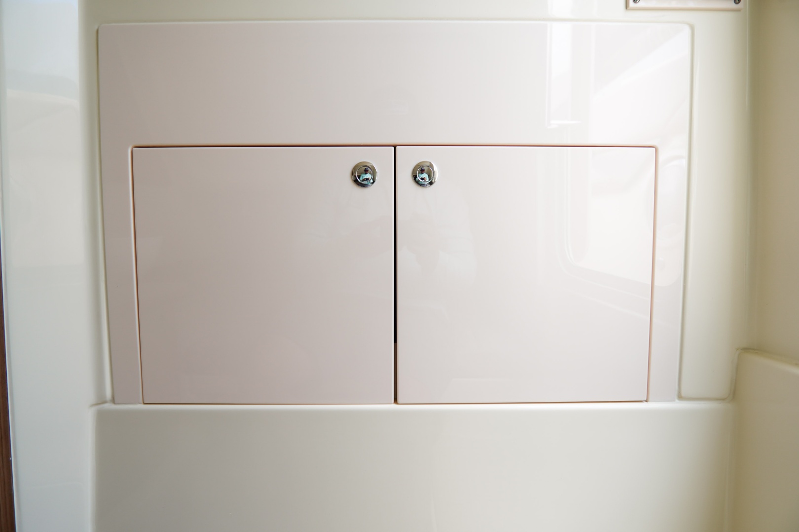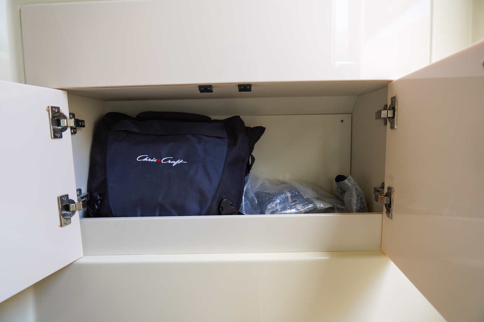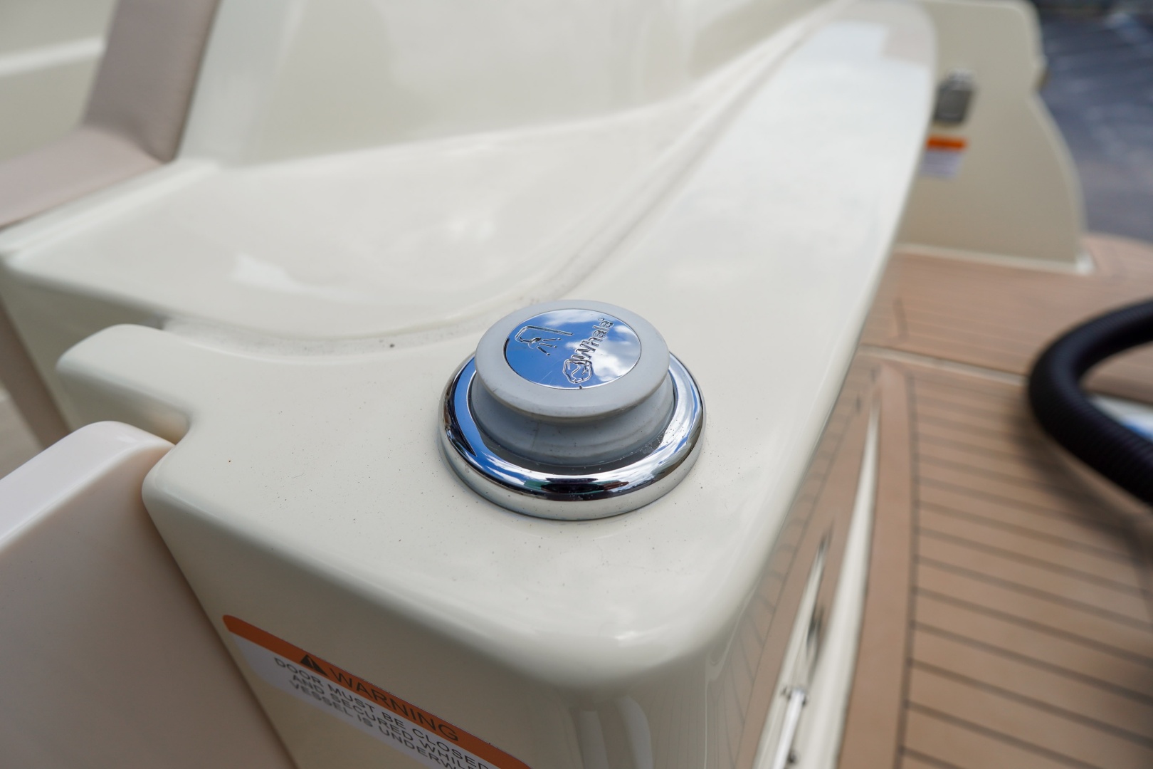 Comfort is a priority with a full air conditioning and heating system, helm vents, teak table with bow and stern mounts, and a premium upgraded sound system with additional speakers and subwoofer. The lithium-ion battery system ensures efficient, reliable power, complemented by a water-ready setup.