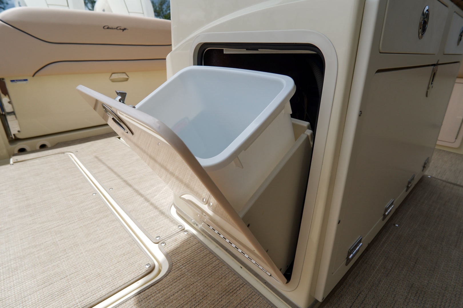 Designed for both serious boating and refined comfort, this vessel features a beautifully appointed interior with walnut wood accents, upgraded Fresco linen upholstery, and woven seagrass flooring. The elevated helm deck platform enhances visibility, while dual 16” Garmin 1643xsv multifunction displays provide advanced navigation, engine data, sonar, VHF, and stereo integration.